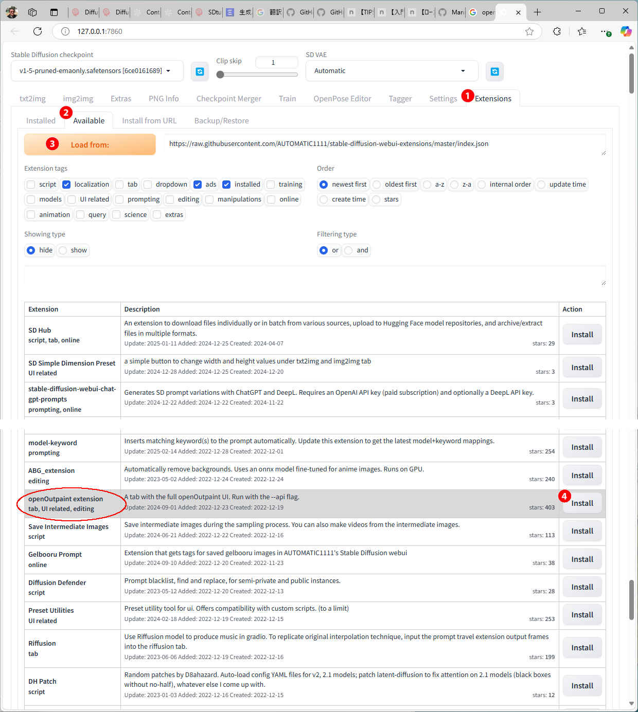 ④ openOutpaint extention tab UI related, editting の項を確認「Install」ボタンを押す