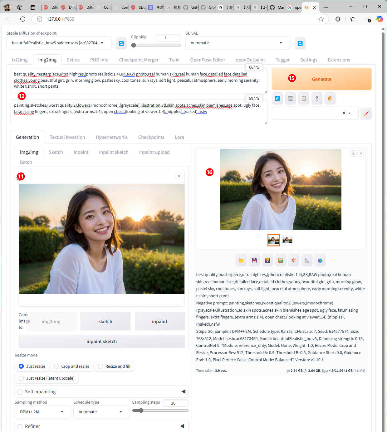 ⑭「ControlNet」の設定。「reference_only」を使用成