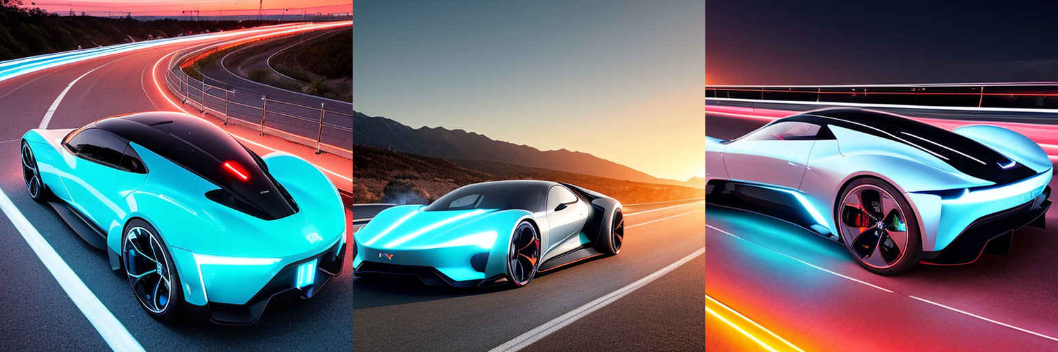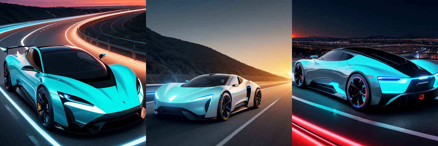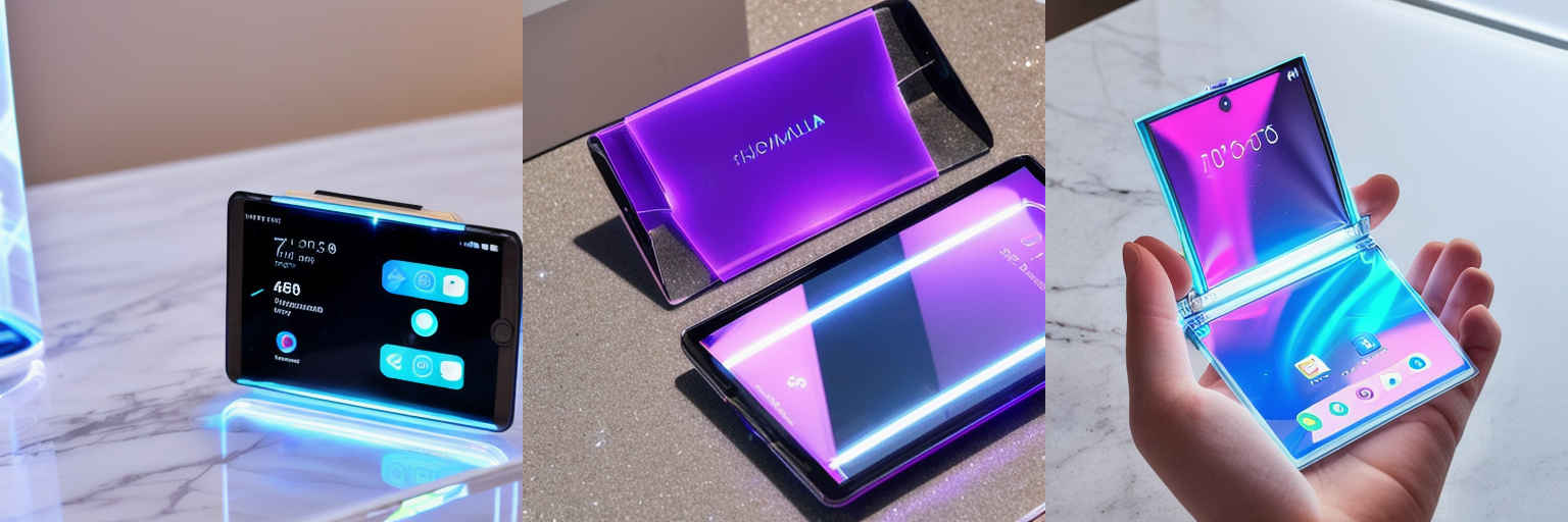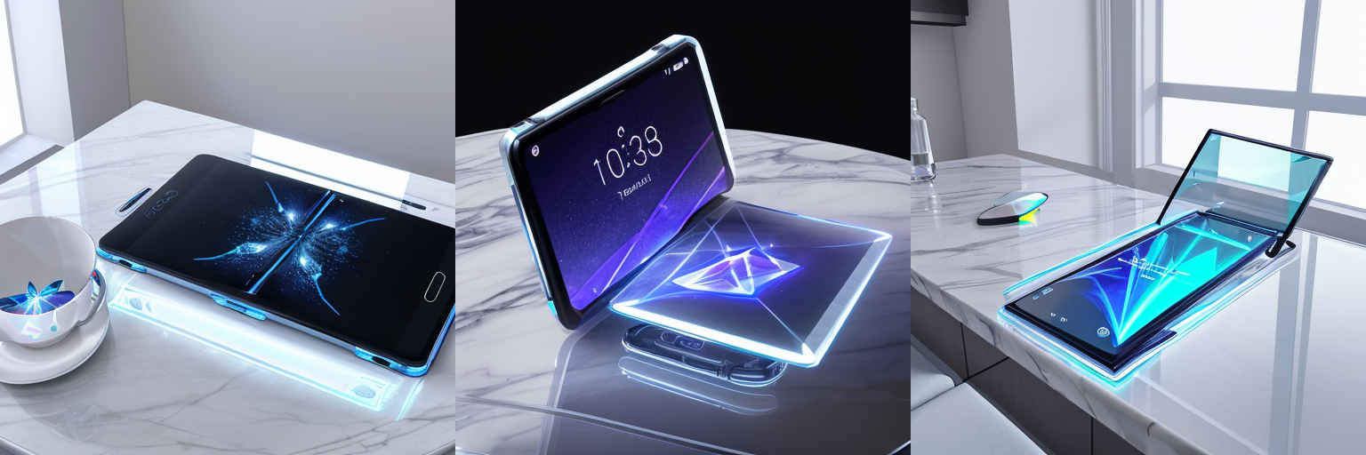 | A foldable smartphone with a seamless glass body, holographic buttons, and a transparent display, set on a marble table with soft lighting | A sleek electric sports car with aerodynamic curves, glowing LED lines, and solar-powered panels, displayed on a futuristic highway at sunset |