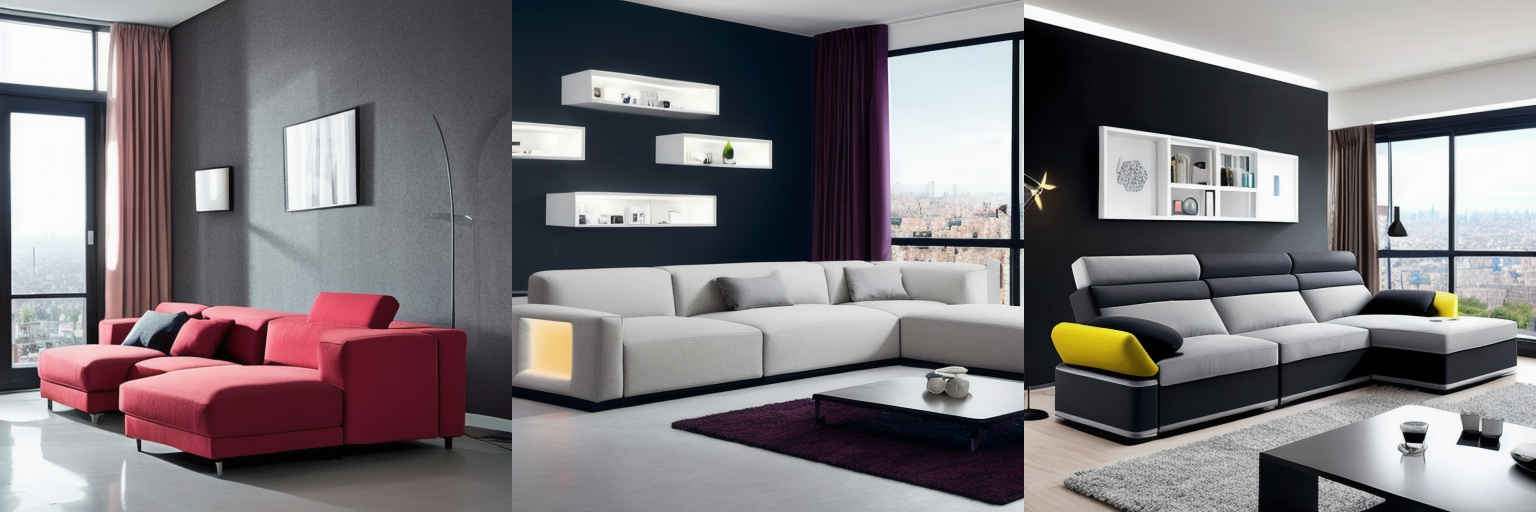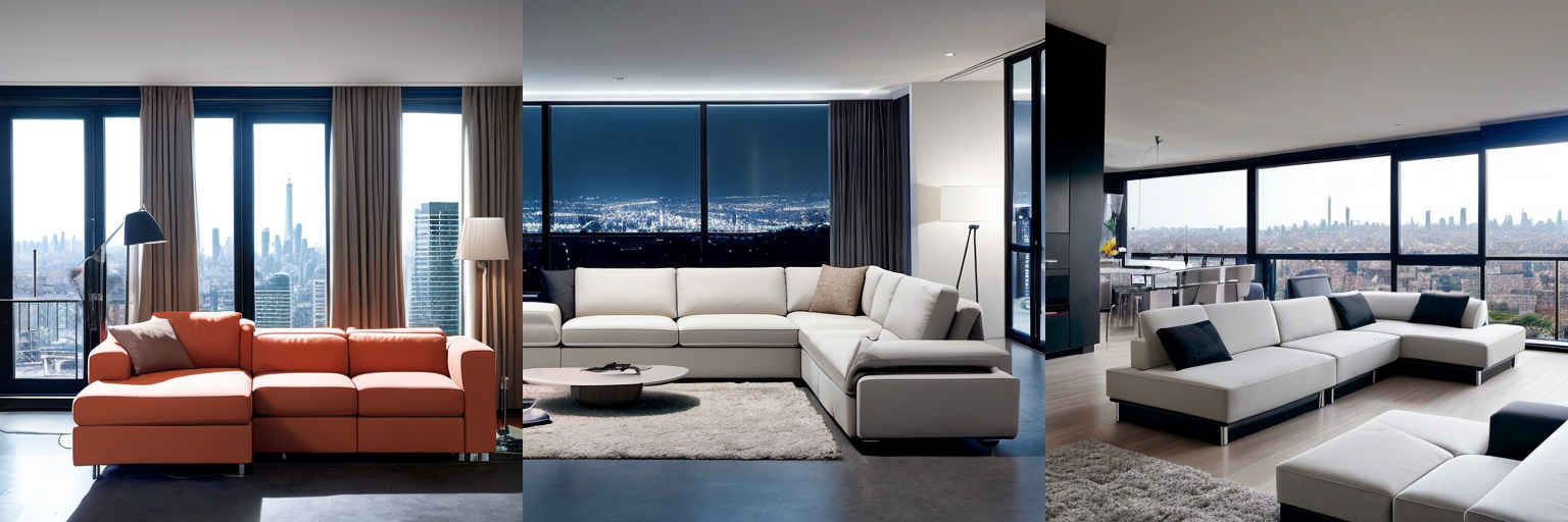 | A modular sofa with adaptive cushioning and embedded LED lighting, set in a modern living room with a panoramic city view | A futuristic smartwatch with a curved OLED display |