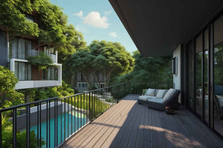 | A modern street-facing house with lush greenery on the balcony and in front of the house, portrayed in the style of digital illustration. Inspired by the artist Simon Stlenhag, the scene captures a futuristic blend of architecture and nature. The color palette leans towards cool blues and warm greens, evoking a serene ambiance. The facial expressions of the people on the balcony reflect a sense of tranquil contentment. Soft, diffused lighting enhances the dreamy atmosphere |