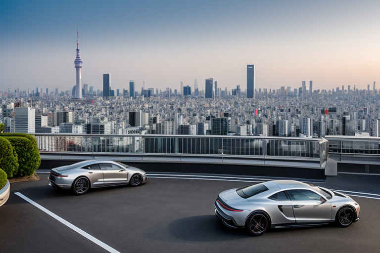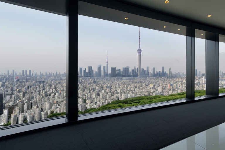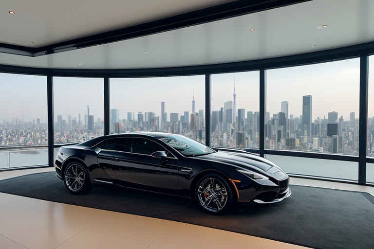 | A luxury car showroom with a panoramic view of the Tokyo skyline |