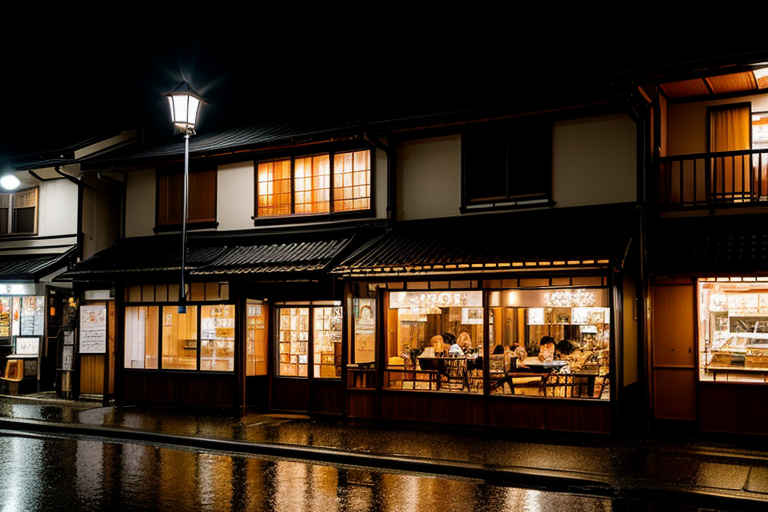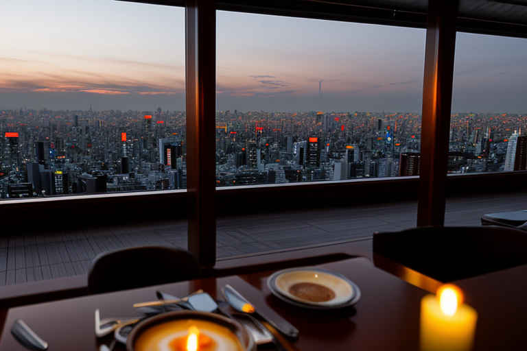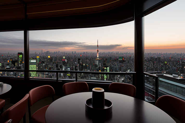 | A warm cafe with a panoramic view of Tokyo at dusk |