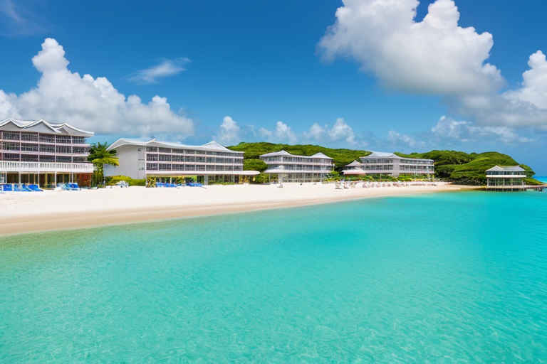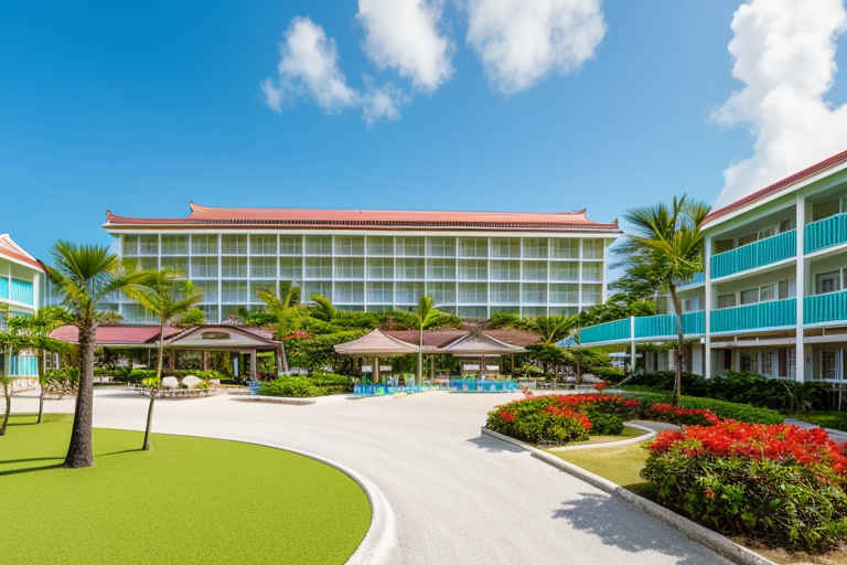 | 陽光降り注ぐ沖縄のビーチに建つリゾートホテル |