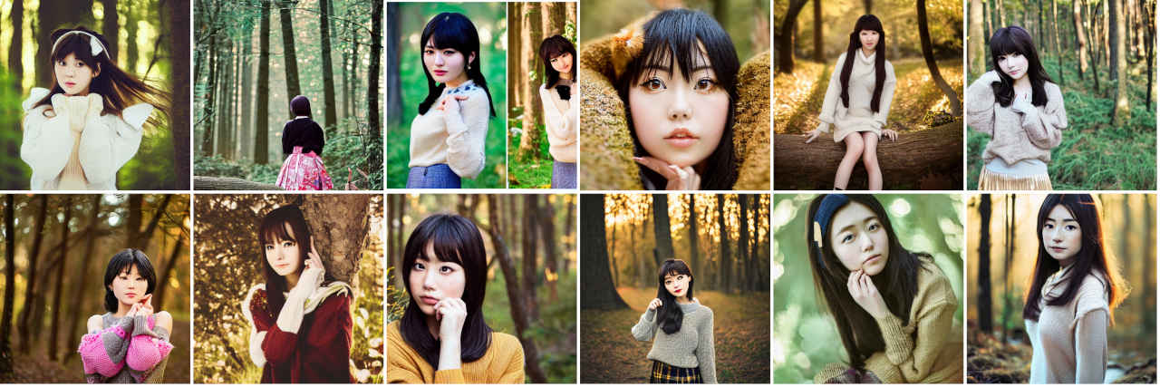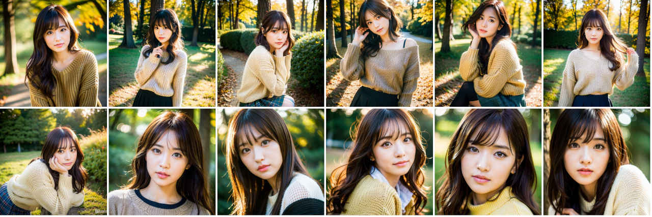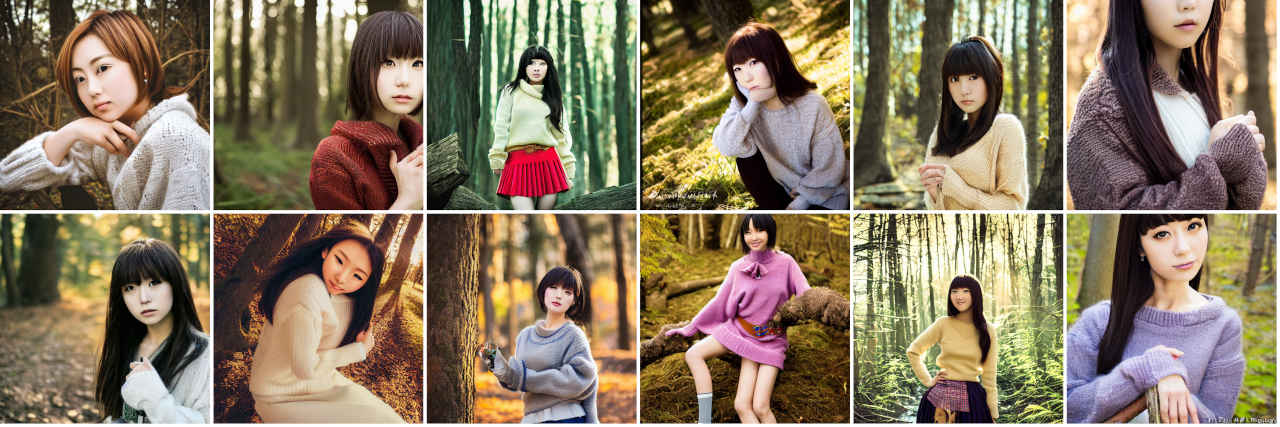 | Prompt | Photographic portrait of Japanese idol, cute face, cute eyes, sweater, skirt, SIGMA 85mm F1.4 DG DN Art, golden hour, forest, by Daniel F Gerhartz |