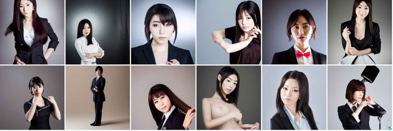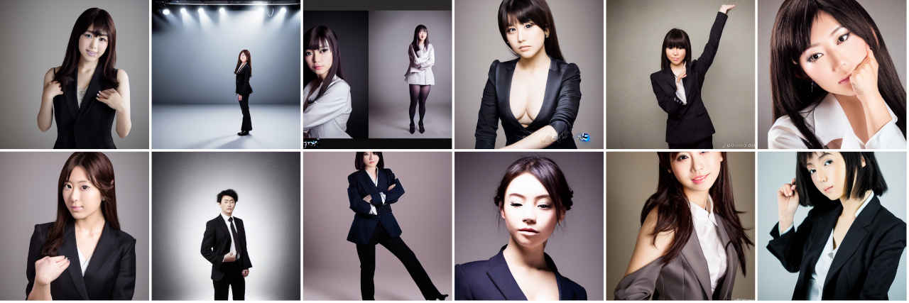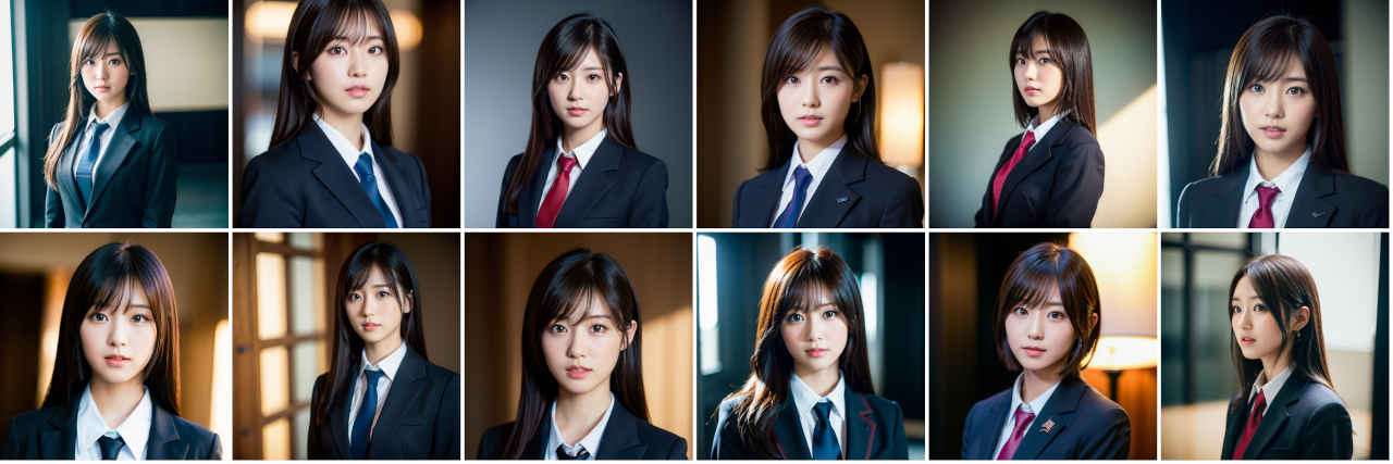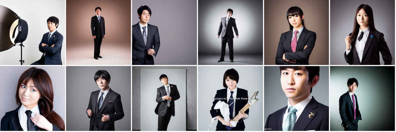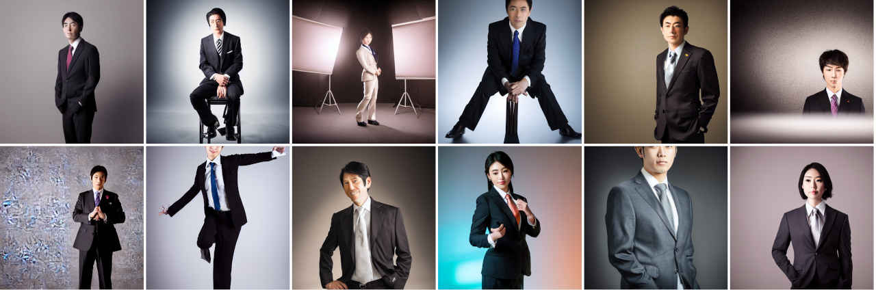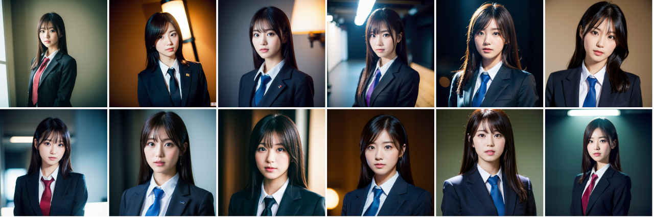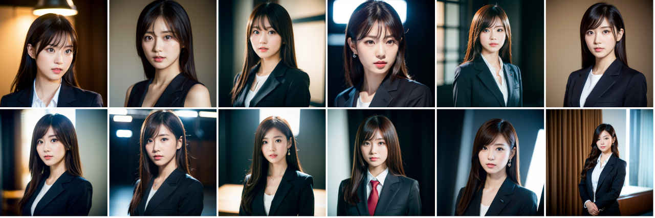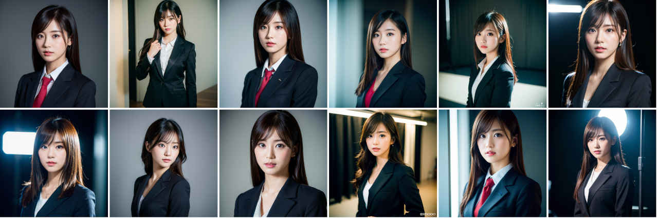 | Prompt | Portrait photography of beautiful Japanese idol, studio portrait, standing, wearing dark colored business suit, volumetric studio lighting by Godox AD200, medium shot, sharp focus, light colored ambient background, Sony α7, SIGMA 85mm F1.4 DG DN Art |
