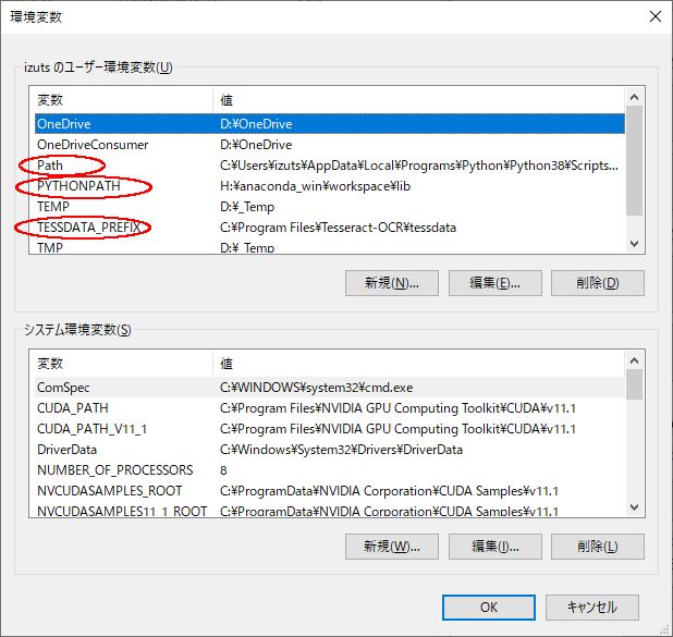 (base) PS > echo $env:Path C:\Users\USER\anaconda3;.................................;C:\Program Files\Tesseract-OCR;. (base) PS > echo $env:TESSDATA_PREFIX C:\Program Files\Tesseract-OCR\tessdata (base) PS > echo $env:PYTHONPATH C:\anaconda_win\workspace_py37\mylib