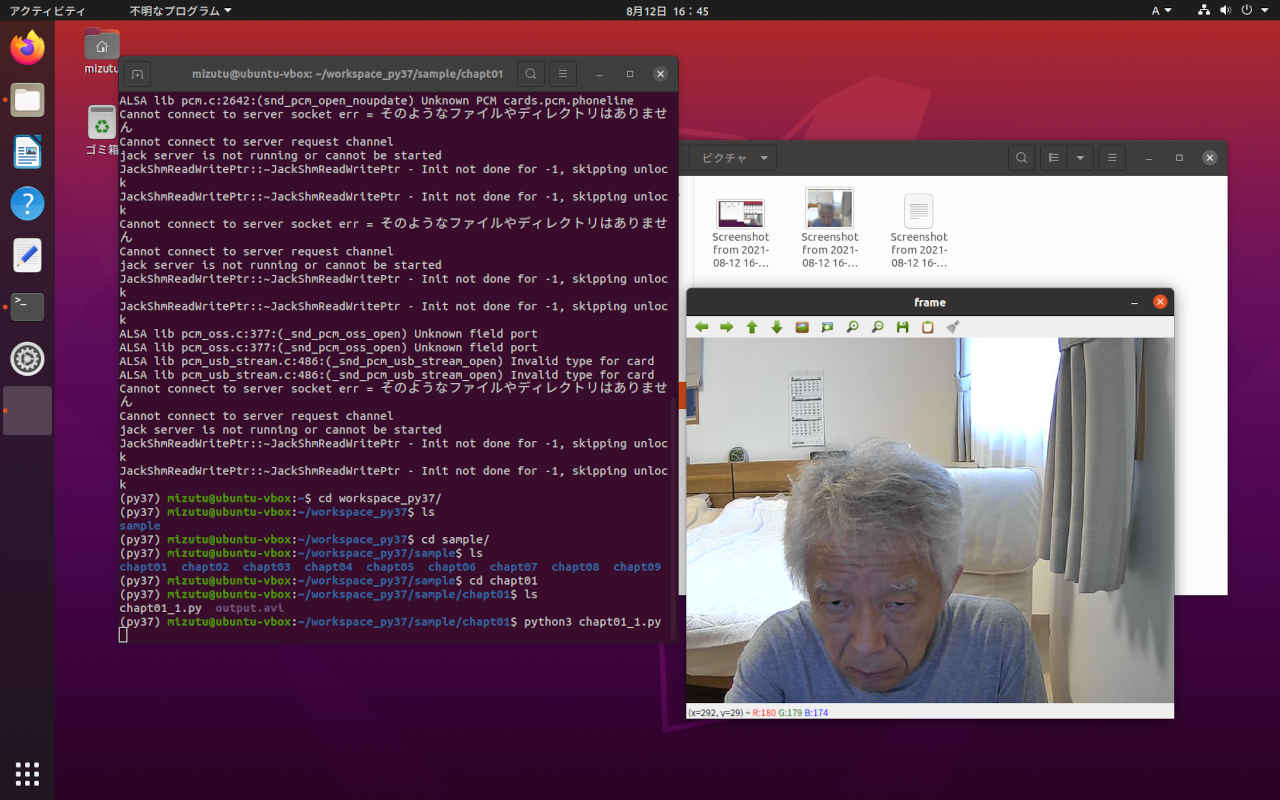 (py37) $ conda info -e # conda environments: # base /home/mizutu/anaconda3 py37 * /home/mizutu/anaconda3/envs/py37 (py37) $ mkdir workspace_py37 (py37) $ ls __share workspace_py37 ドキュメント 公開 anaconda3 ダウンロード ビデオ anaconda3_setup.sh テンプレート ピクチャ vbox_anaconda_install_log1.txt デスクトップ ミュージック (py37) $ cd workspace_py37/ (py37) $ tree . └── sample ├── chapt01 │ ├── chapt01_1.py │ └── output.avi ├── chapt02 │ ├── chapt02-sample.mp4 │ ├── chapt02_1.py │ └── chapt02_2.py ├── chapt03 │ ├── chapt03-sample.mp4 │ ├── chapt03-validate.mp4 │ ├── chapt03_1.py │ └── chapt03_2.py ├── chapt04 │ ├── chapt04_1.py │ ├── chapt04_2.py │ ├── testdata │ │ ├── images │ │ │ └── forest-path │ │ │ ├── 1.jpg │ │ │ ├── 2.jpg │ │ │ └── 3.jpg │ │ └── labels │ │ └── forest-path │ │ ├── 1.txt │ │ ├── 2.txt │ │ └── 3.txt │ └── testdata.yaml ├── chapt05 │ ├── chapt05-background.mp4 │ ├── chapt05-person.mp4 │ ├── chapt05_1.py │ ├── chapt05_2.py │ └── chapt05_3.py ├── chapt06 │ ├── chapt06_1.py │ ├── chapt06_2.py │ └── chapt06_3.py ├── chapt07 │ ├── chapt07_1.py │ └── chapt07_2.py ├── chapt08 │ ├── chapt08_1.py │ ├── misc │ │ └── nihongo.py │ └── nets │ └── classifiernet.py └── chapt09 ├── chapt09.ipynb ├── chapt09_1.py ├── misc │ ├── detection.py │ ├── nihongo.py │ ├── nms.py │ └── structure.py ├── nets │ ├── block.py │ └── detectionnet.py └── yokogaki.png 19 directories, 40 files