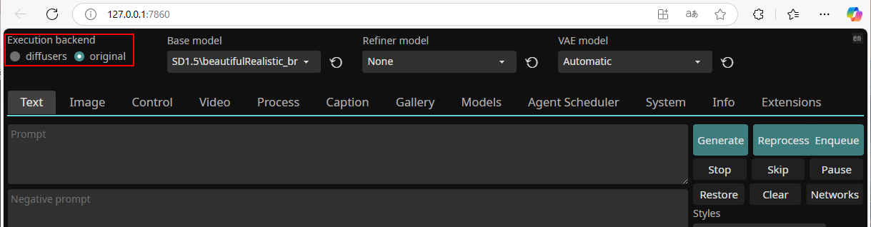 - 「SD1.5」モデル、Execution backend: original の設定で使用する};