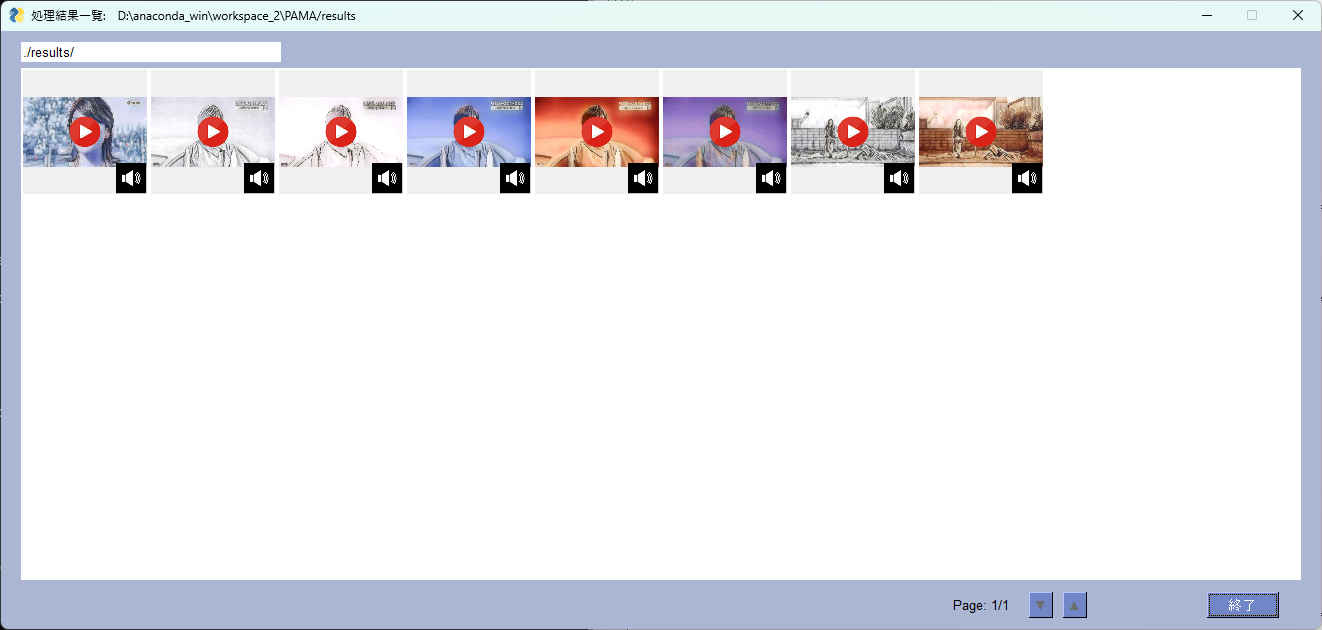 my_thumbnail.movie_dialog(file_path=RESULT_PATH, title=msg, theme=DEF_THEME, xn=10, yn=4, thumb_size=128, gap=4, ret='終了', audio_f=True, logger=logger)