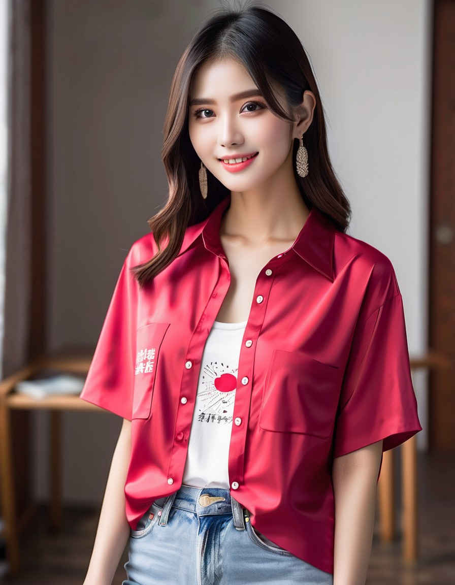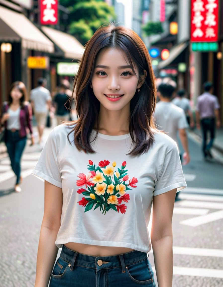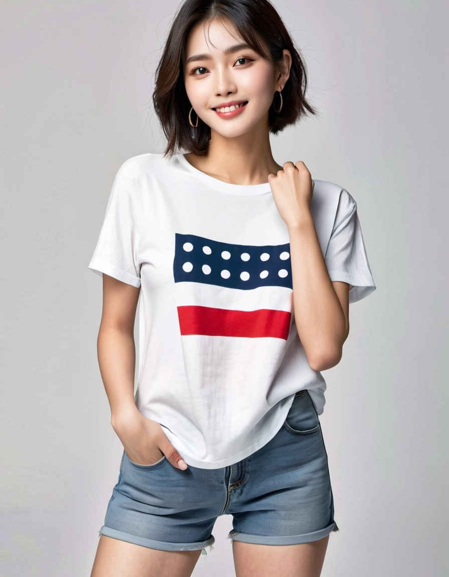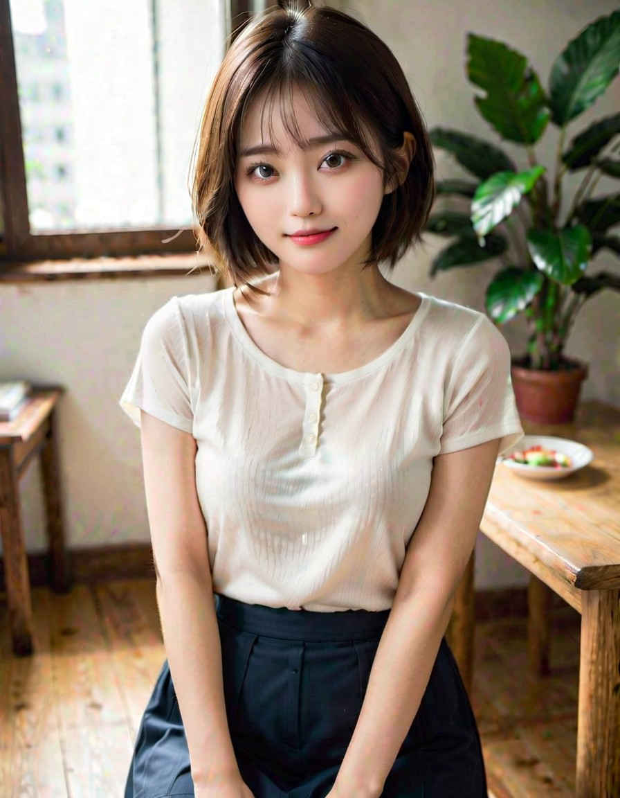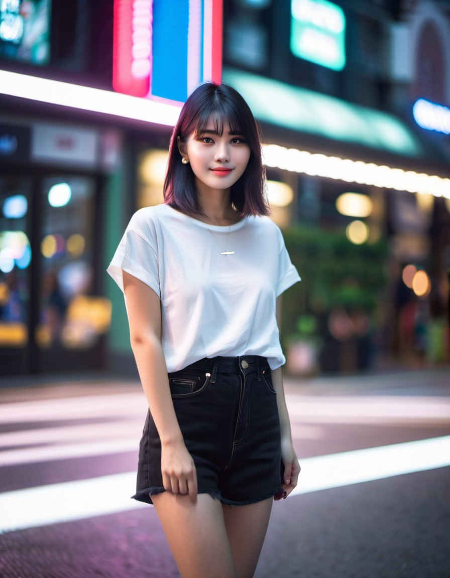 | (8k、最高品質、傑作、超高解像度:1.2)、日本人女性の写真、20 歳、T シャツ、笑顔、太ももに焦点を当て、立っています <lora:ayame_LoRA_v20:1.0> |