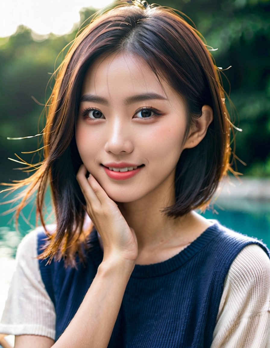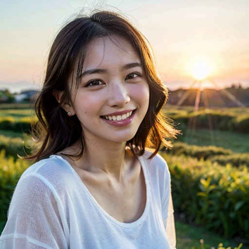| 最高品質、傑作、超高解像度、(フォトリアル:1.4)、8K、RAW写真、本物の人間の肌、本物の人間の顔、詳細な顔、詳細な服、若い美しい女の子、笑顔、朝焼け、パステルカラーの空、クールな色調、太陽光線、柔らかな光、穏やかな雰囲気、早朝の静けさ、白いTシャツ、ショートパンツ | |