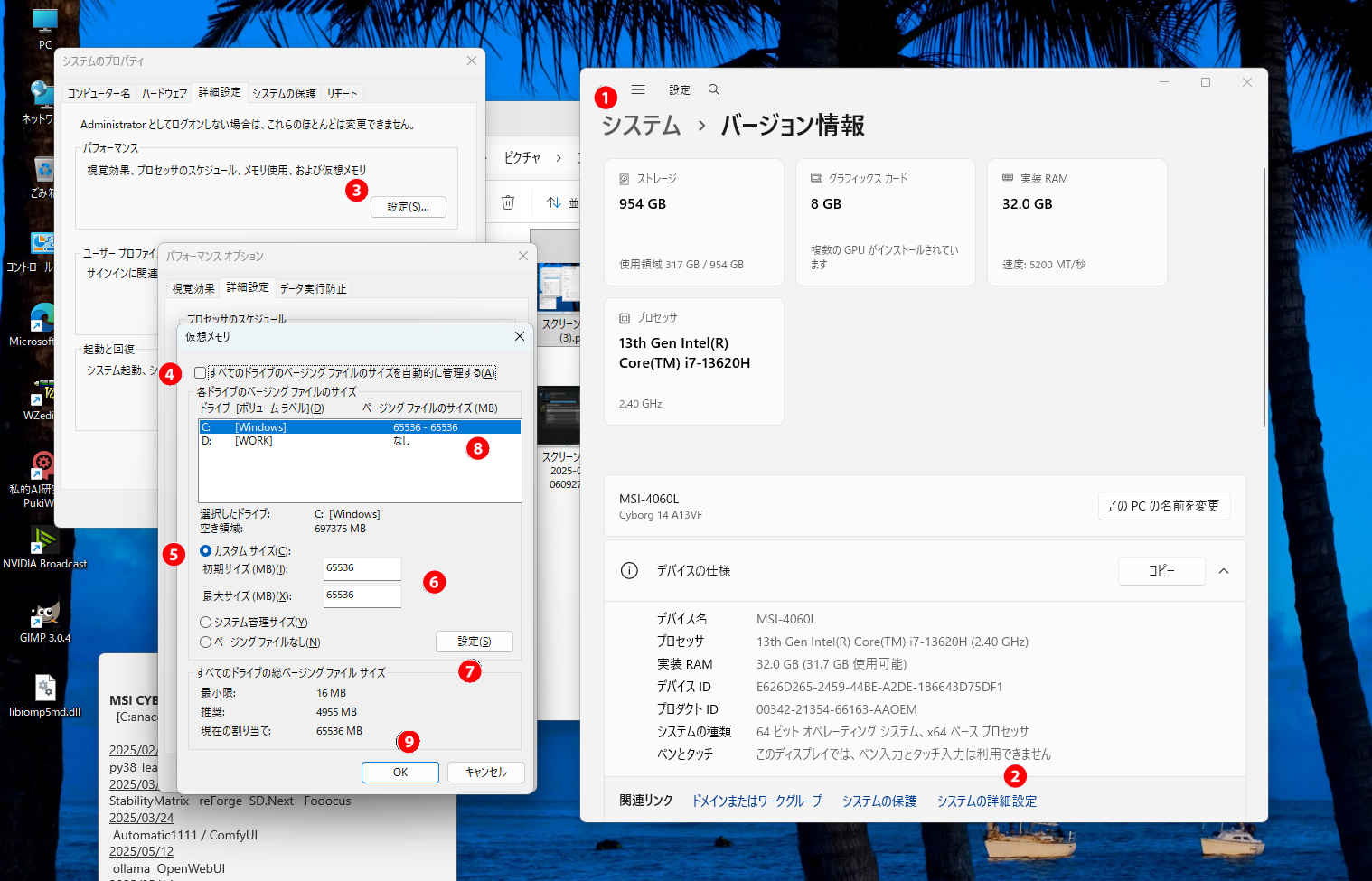1. Windows の場合「ページングファイル」を設定する(以後の安定動作のために推奨)