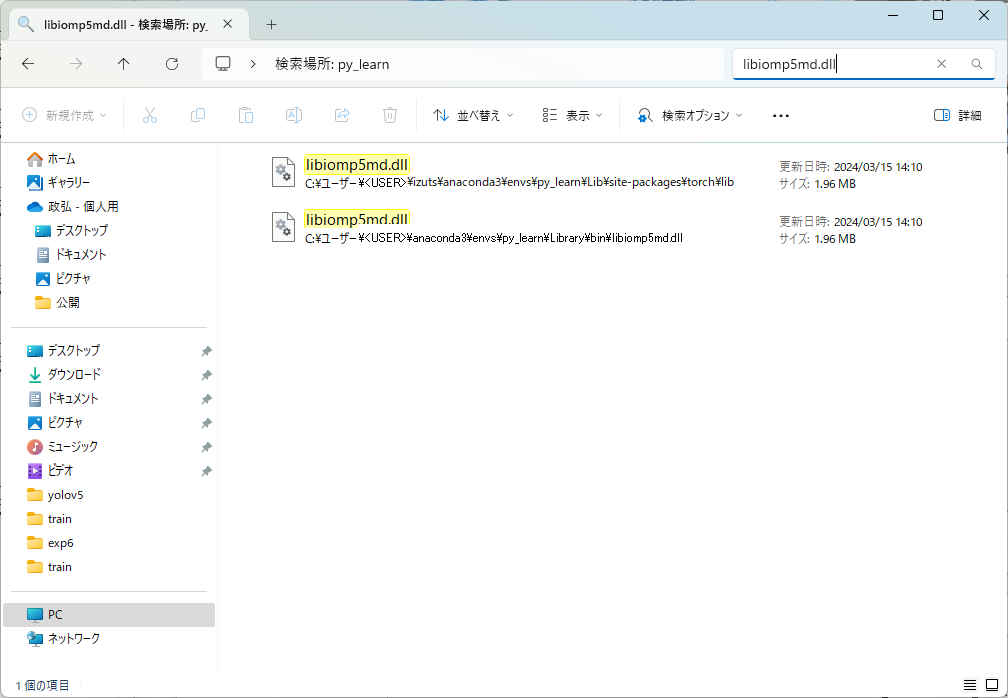 "C:\Users\<USER>\anaconda3\envs\sd_test\Lib\site-packages\torch\lib\libiomp5md.dll" "C:\Users\<USER>\anaconda3\envs\sd_test\Library\bin\libiomp5md.dll ← 削除"2. 2つ目の「libiomp5md.dll」を削除
