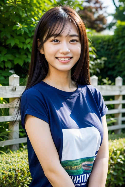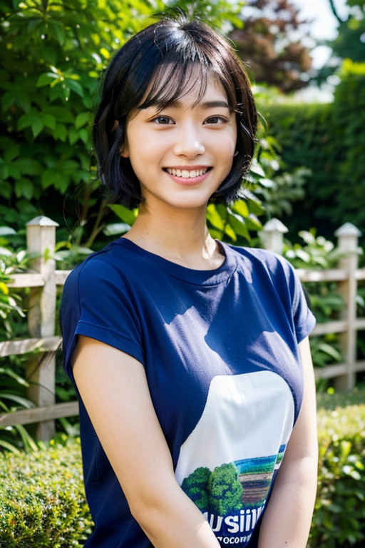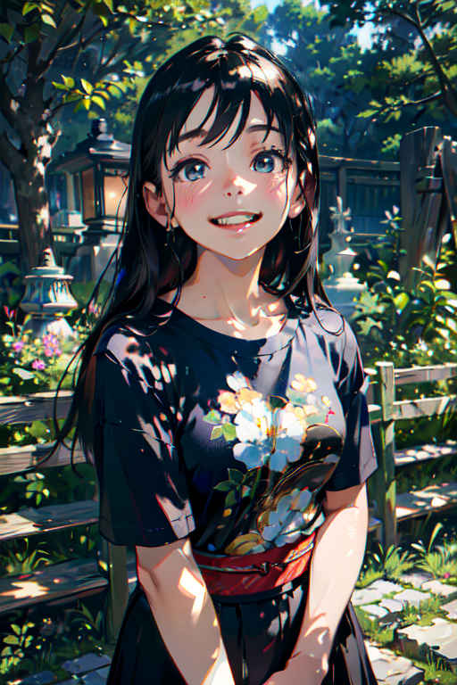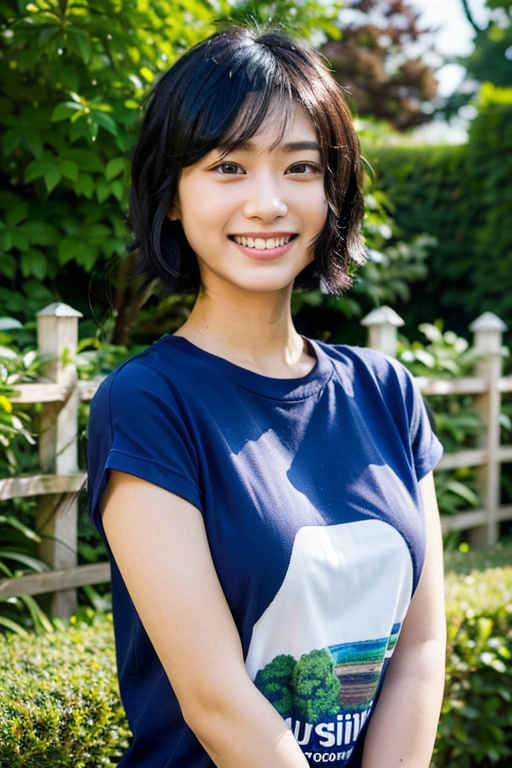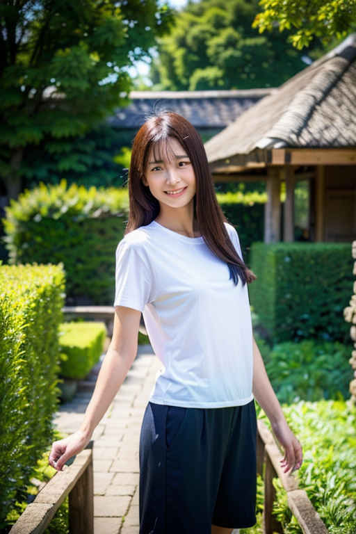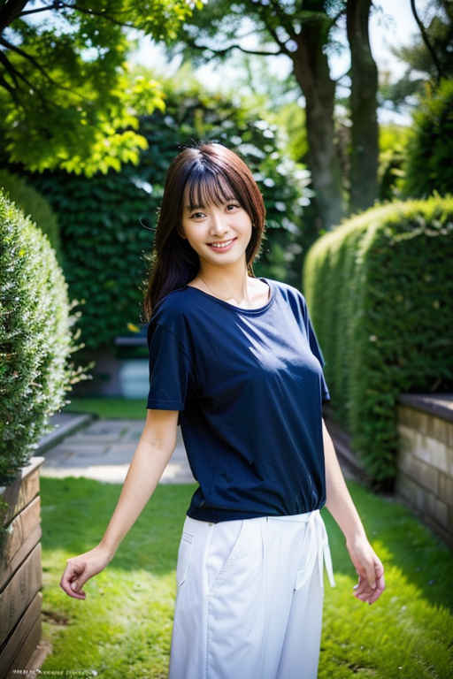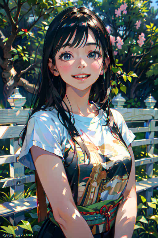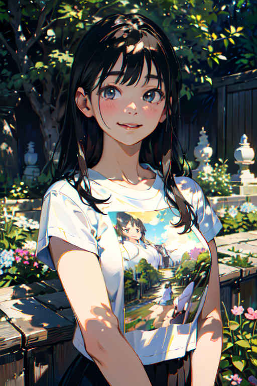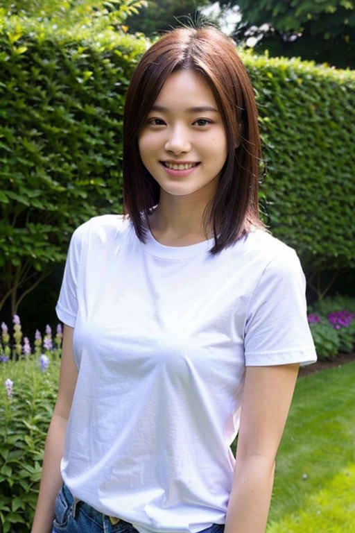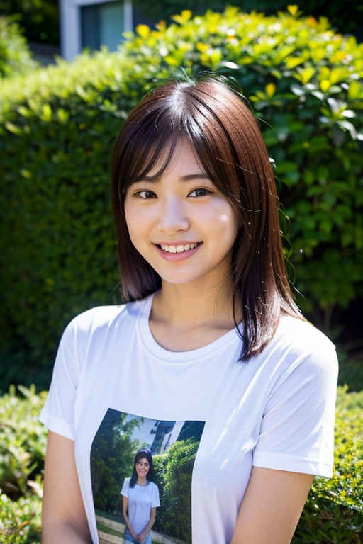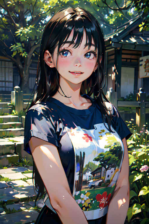 | 最高品質、傑作、超高解像度、(フォトリアリスティック: 1.4)、RAW 写真、美しい日本人女性、20 歳、ポートレート、立っている、見る人を見て、笑顔、T シャツ、庭で |