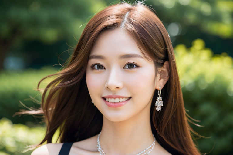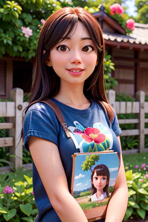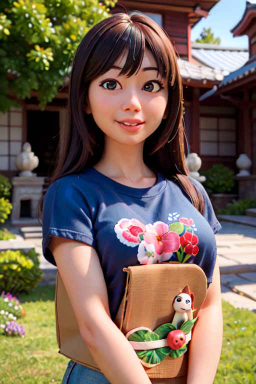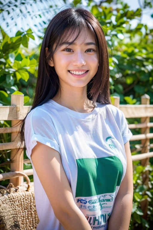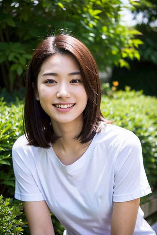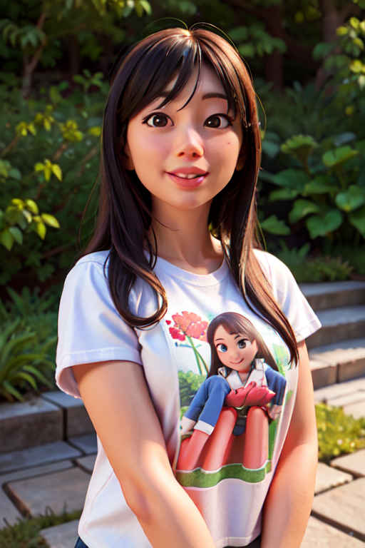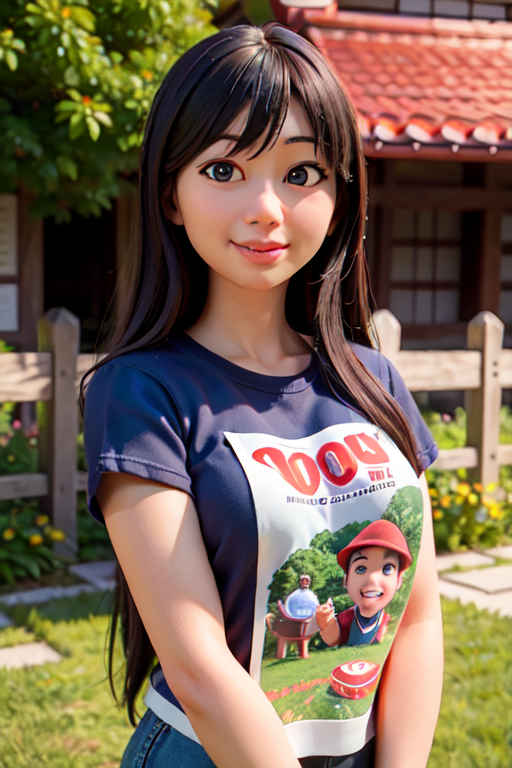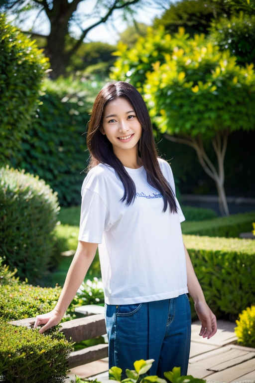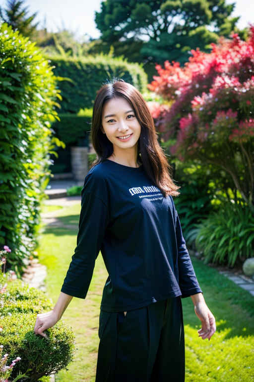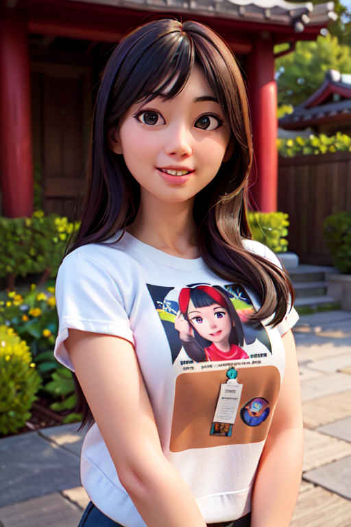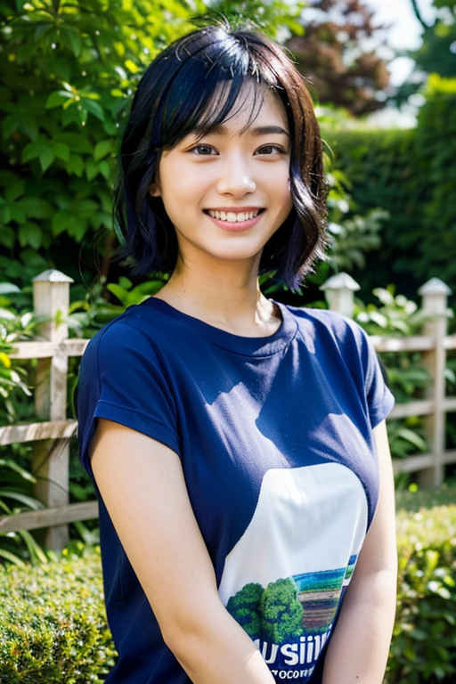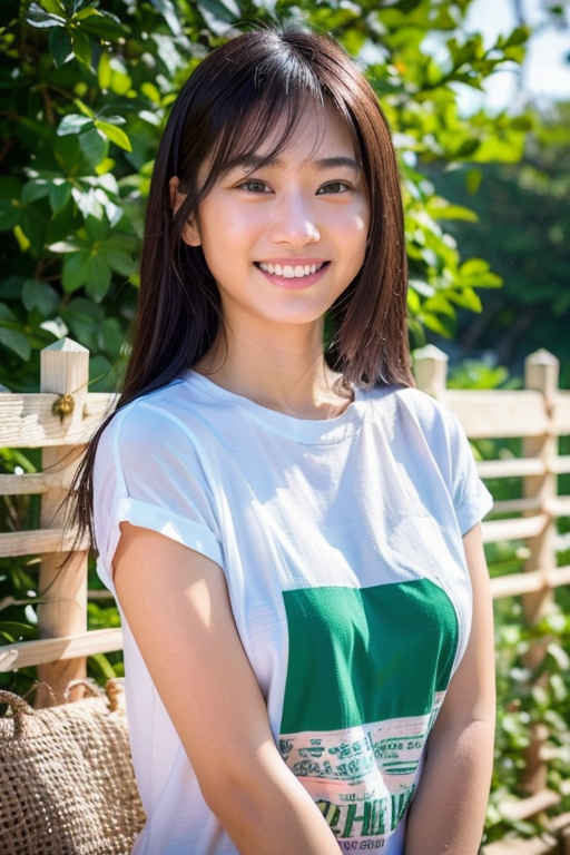 | 最高品質、傑作、超高解像度、(フォトリアリスティック: 1.4)、RAW 写真、美しい日本人女性、20 歳、ポートレート、立っている、見る人を見て、笑顔、T シャツ、庭で |