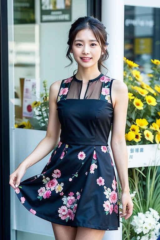 | P2 | a woman in a dress posing for a picture in front of a store front window with a flowered dress on, Du Qiong, japanese, a stock photo, arabesque |