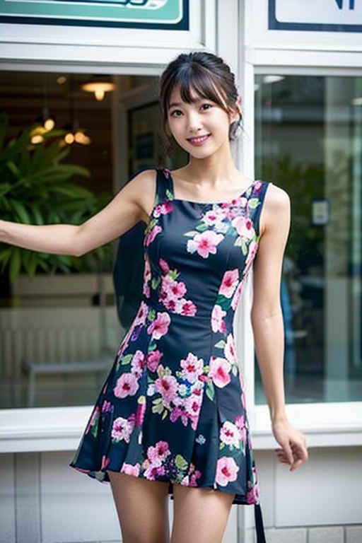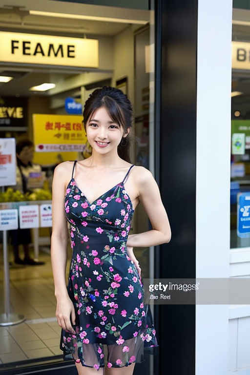 | 花柄のドレスを着た店先の窓の前で写真を撮るドレスを着た女性、杜瓊、日本人、ストックフォト、アラベスク |