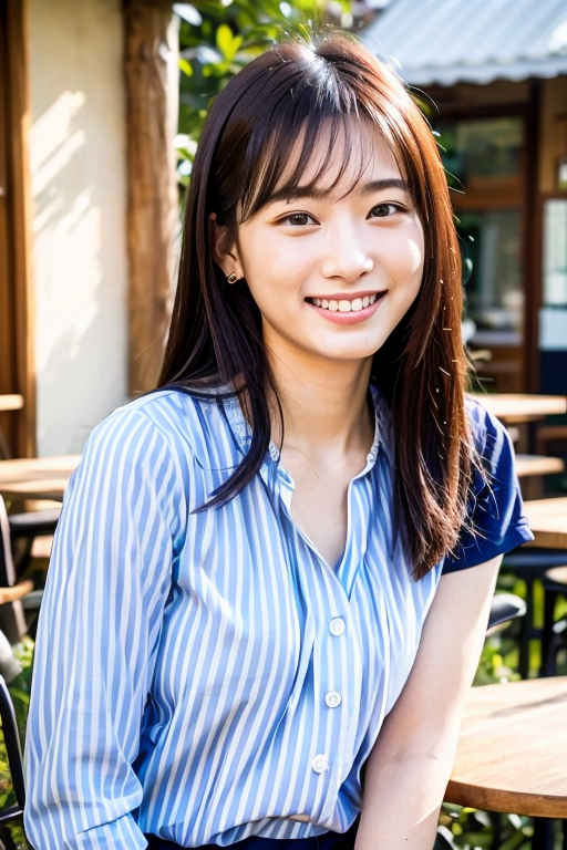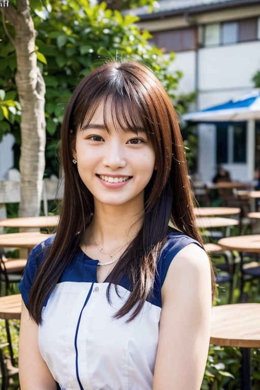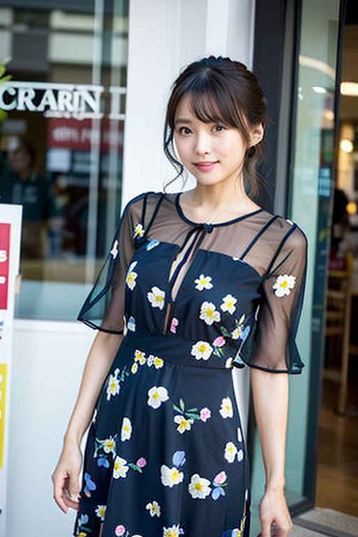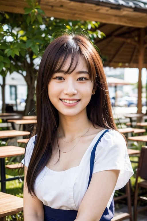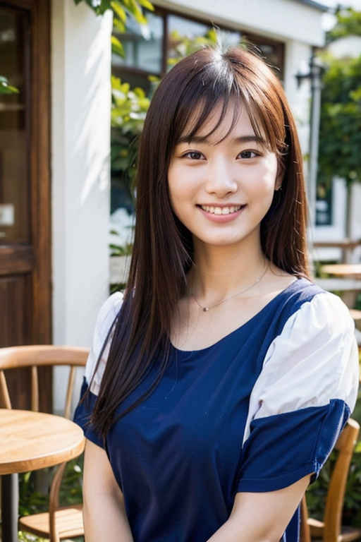 | 最高品質、傑作、超高解像度、(フォトリアリスティック: 1.4)、RAW写真、美しい日本人女性、20歳、ポートレート、立っている、見る人を見る、笑顔、ブラウス、カフェで |