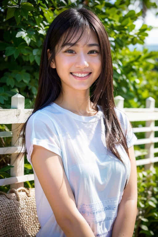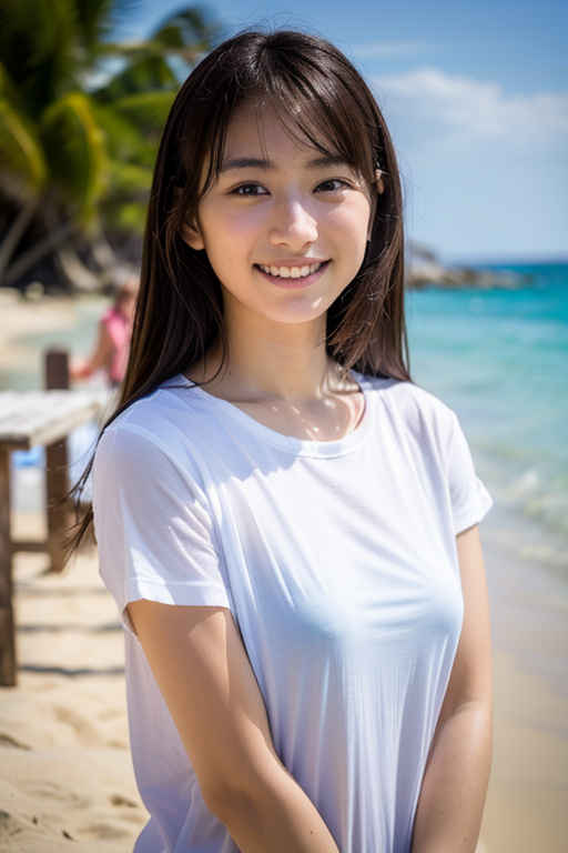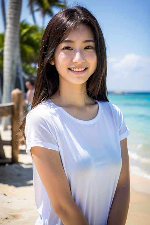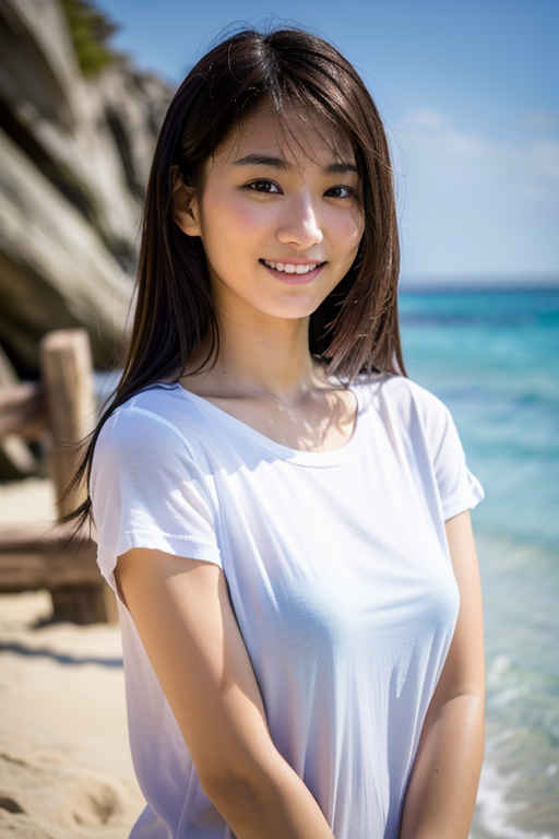 | 最高品質、傑作、超高解像度、(フォトリアリスティック: 1.4)、RAW写真、美しい日本人女性、20歳、ポートレート、立っている、見る人を見て、笑顔、白いTシャツ、ビーチで |