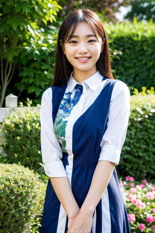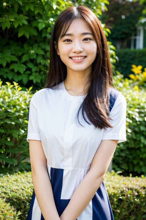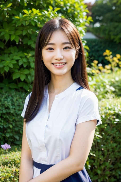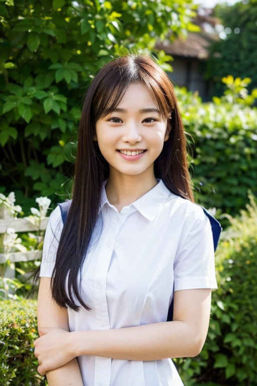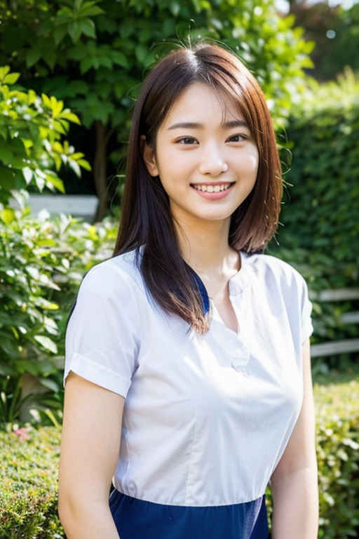 | 最高品質、傑作、超高解像度、(フォトリアリスティック: 1.4)、RAW写真、美しい日本人女性、20歳、ポートレート、立っている、見る人を見る、笑顔、ワイシャツ、庭で |