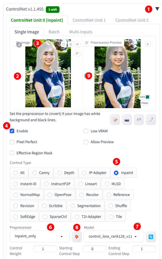 ⑦ inpaint のモデルを確認(Control Type と一致させること)