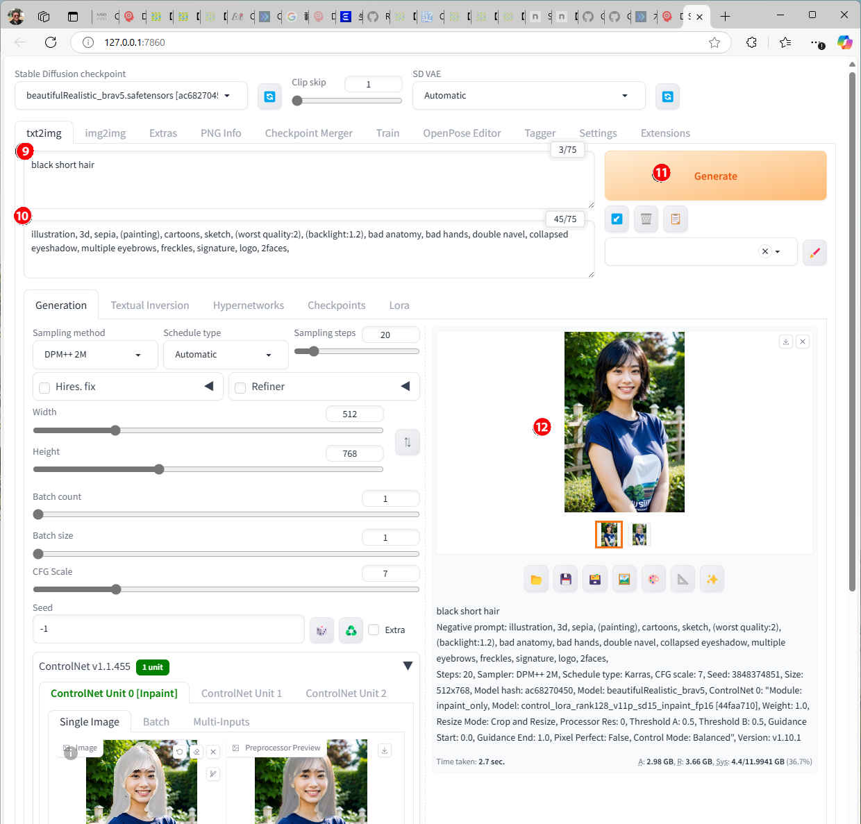 | P1 | best quality,masterpiece,ultra high res,(photorealistic:1.4),RAW photo,a beautiful japanese woman,20yo,portrait,standing,looking at viewer,smile, t-shirt, in garden |