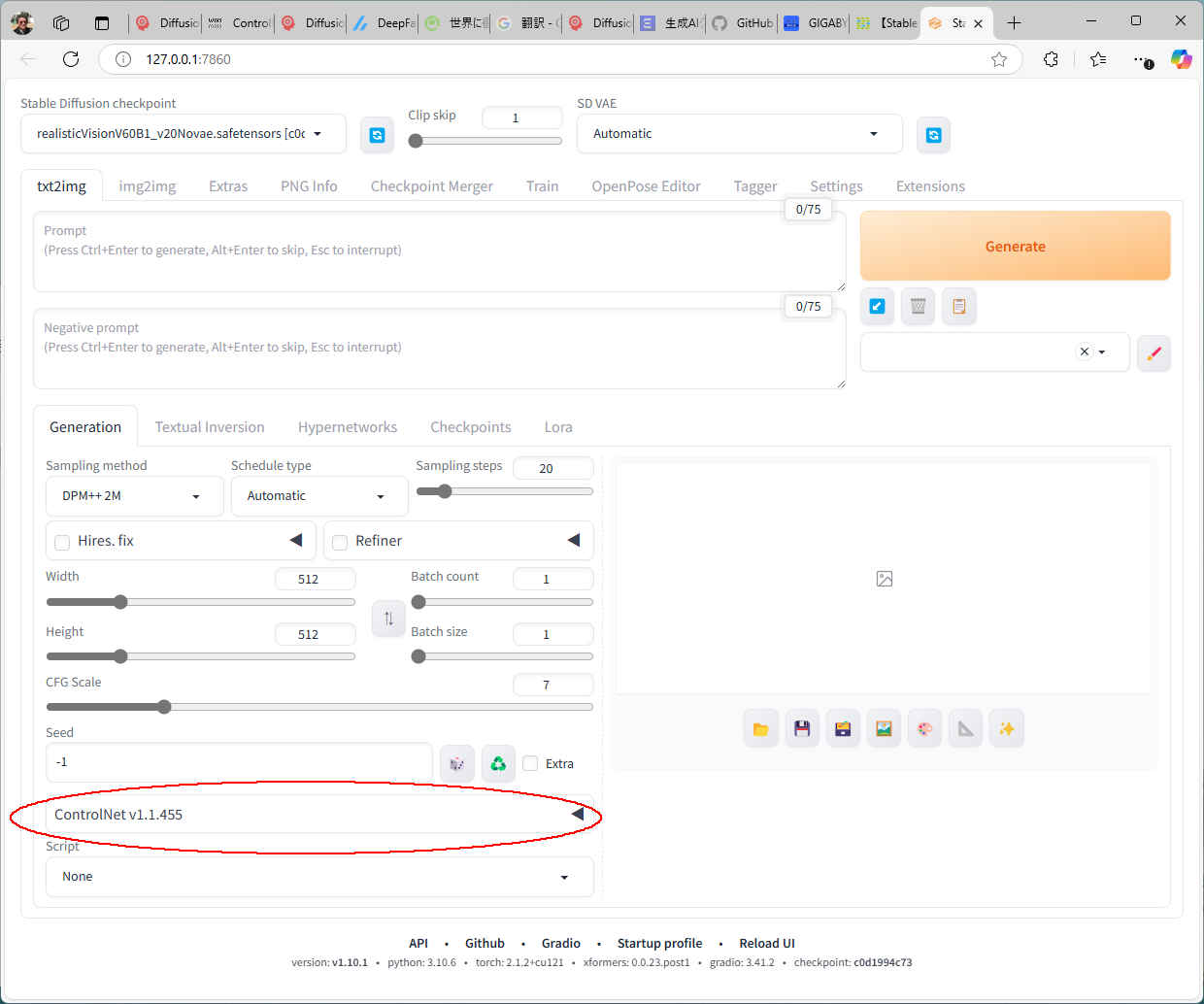 再表示された画面に「ControlNet XXXX」パネルの追加を確認
