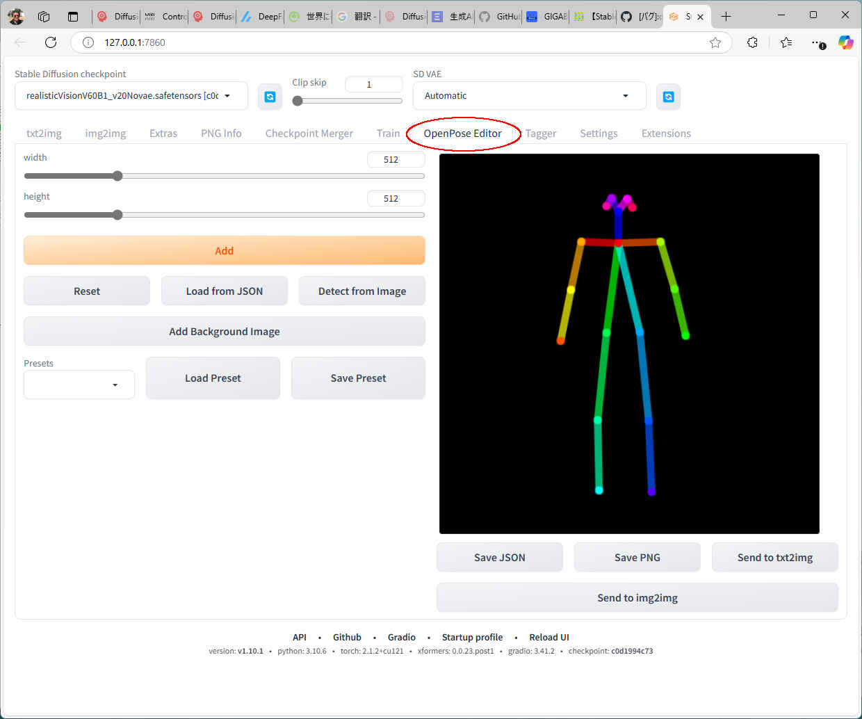 - 「ControlNet OpenPose Editer」をインストールする(現在は「ControlNet」に統合されているので必ずしも必要ではない)