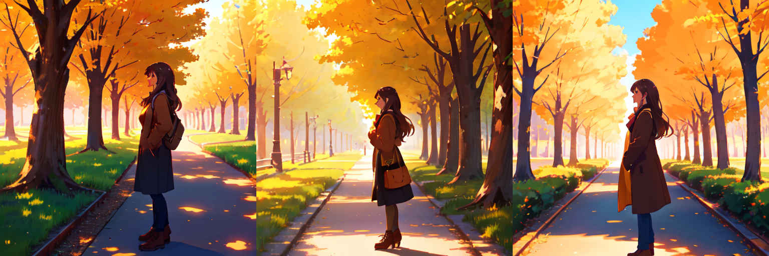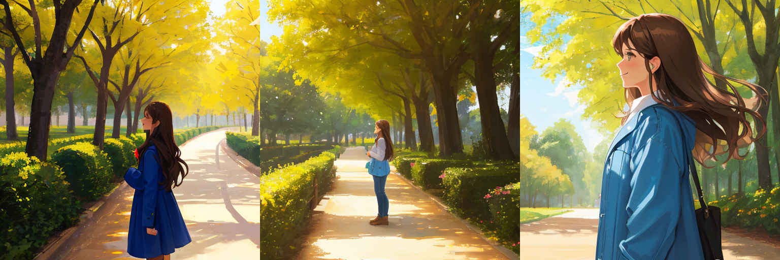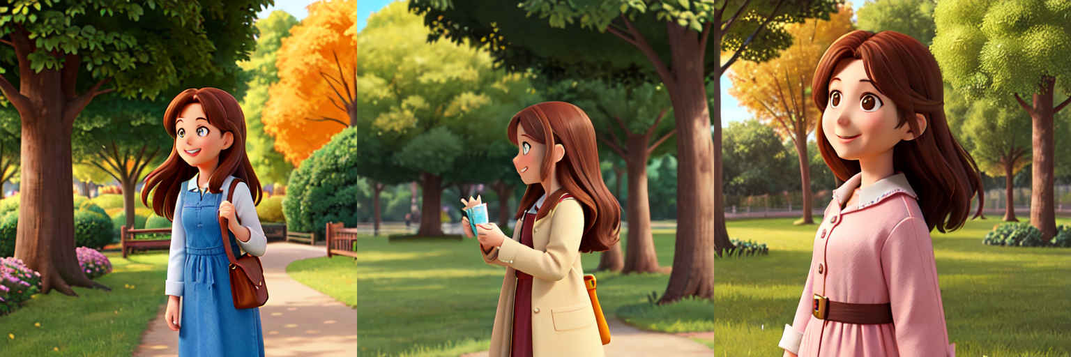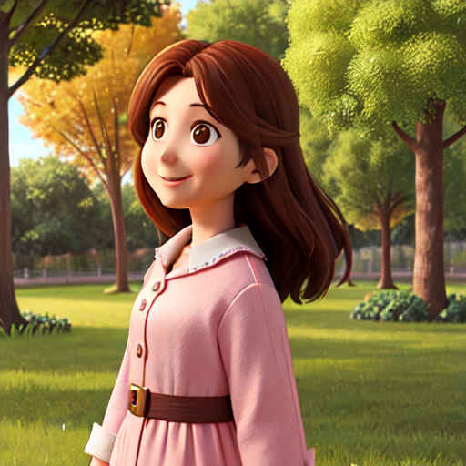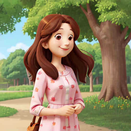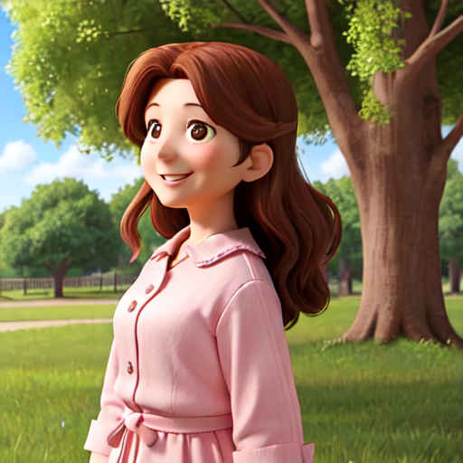 | P3 | profile picture, 1woman, standing, middle aged, happy , long brown hair, outside, sunny park, trees, background, digital art |