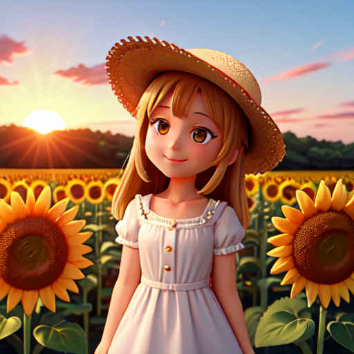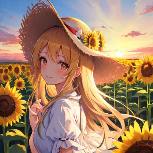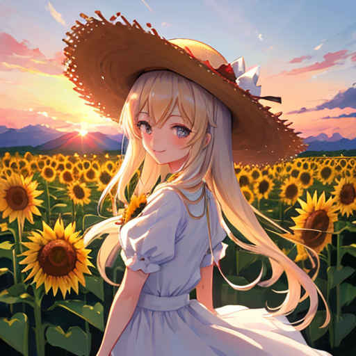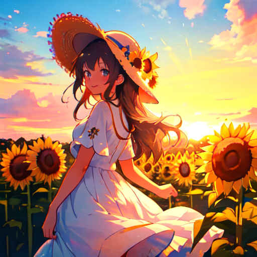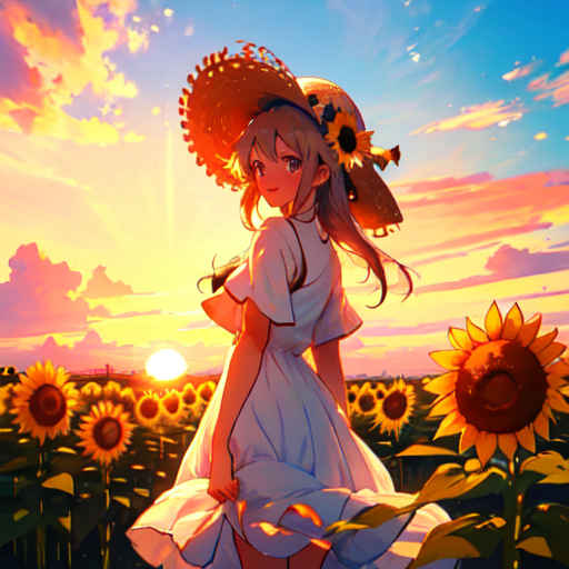 | 白いドレスと麦わら帽子をかぶったアニメの女の子、信じられないほど詳細な顔、信じられないほど詳細な美しい目、顔に焦点を当てる、ひまわり畑の真ん中に立って、優しく微笑む、美しい夕日、夏の空、最高の品質、非常に詳細な | |