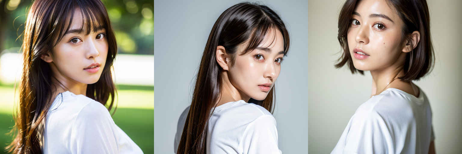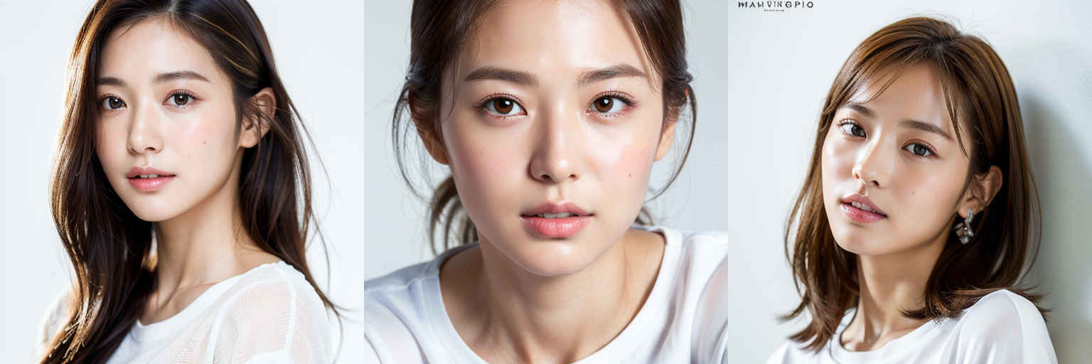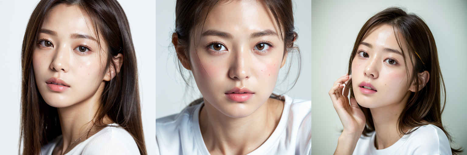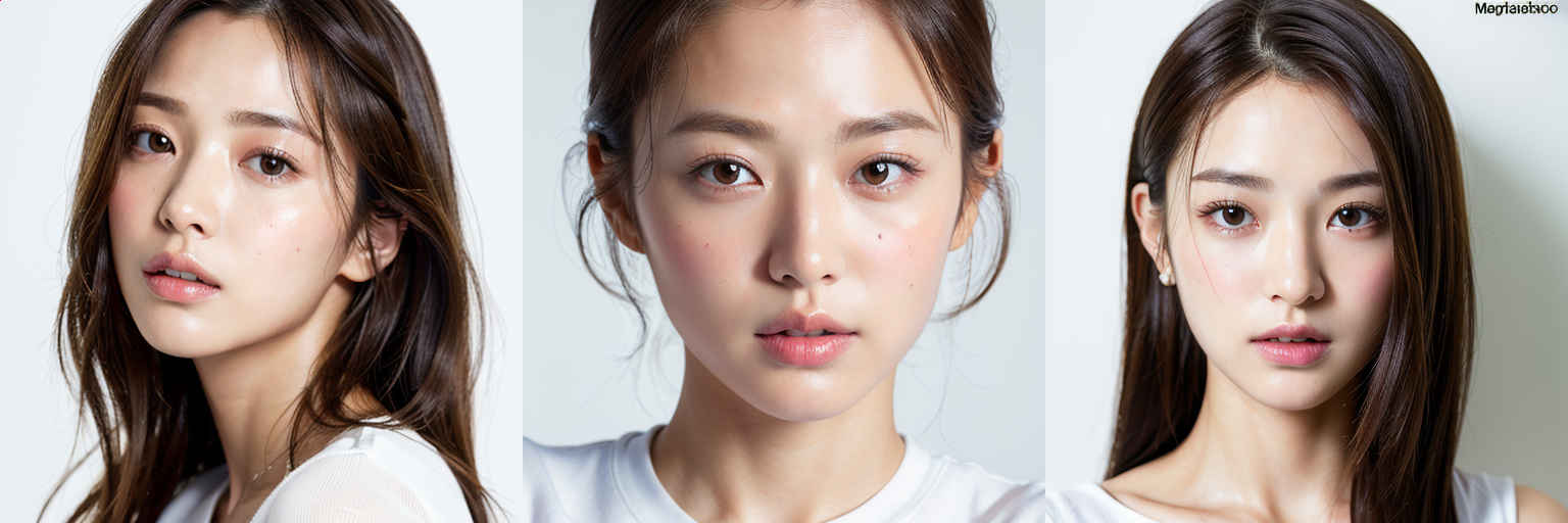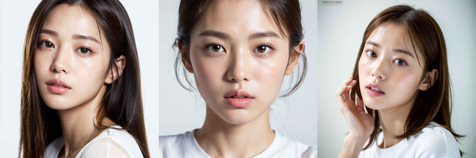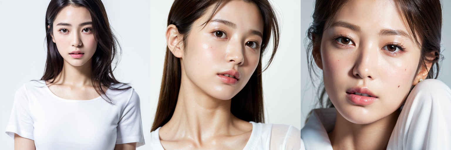 | (傑作、最高品質:1.4)、(8k、生写真、フォトリアル:1.2)、つやのある肌、詳細な肌、詳細な顔、詳細な目、1人の女の子、日本のアイドル、美しい顔、{個別プロンプト}、白背景、白い T シャツを着て | |