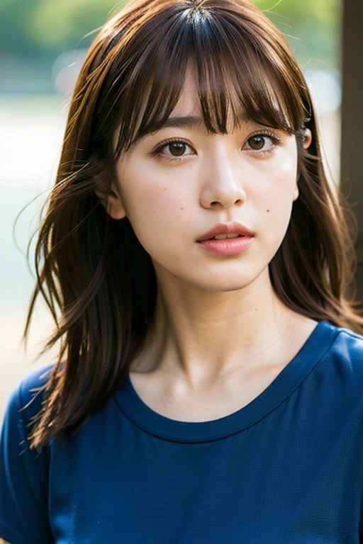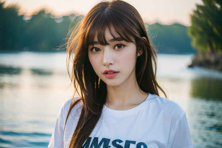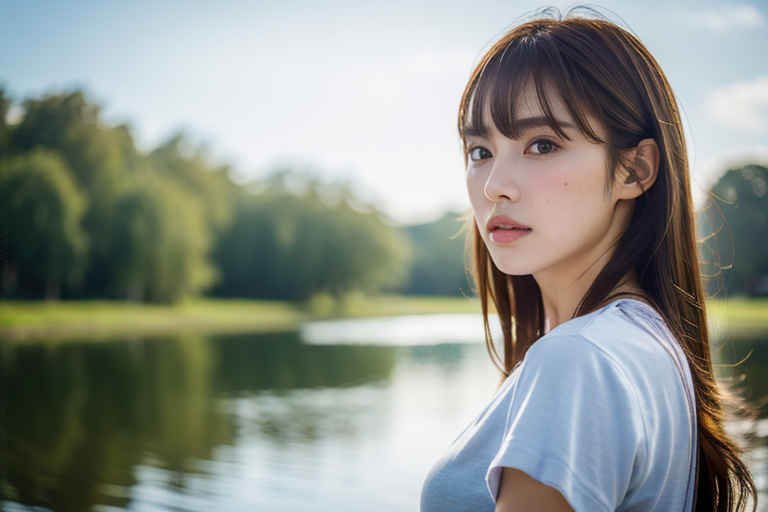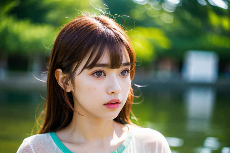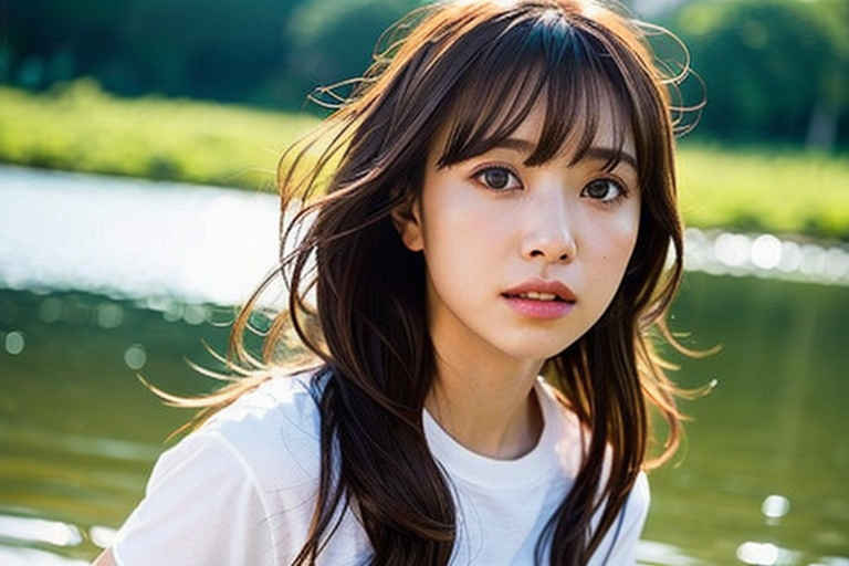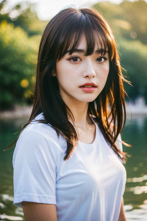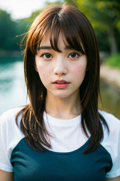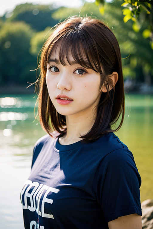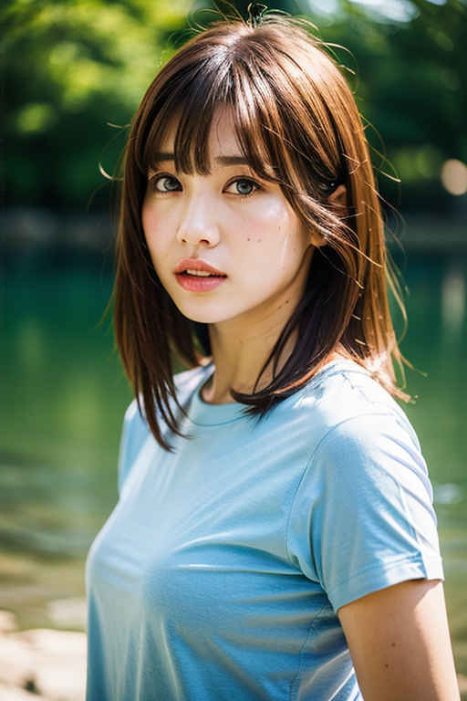 | P2 | 1girl,t-shirt, bangs, blurry, blurry background, brown eyes, brown hair, depth of field, lips, looking at viewer, nose, outdoors, realistic, solo, upper body, water |