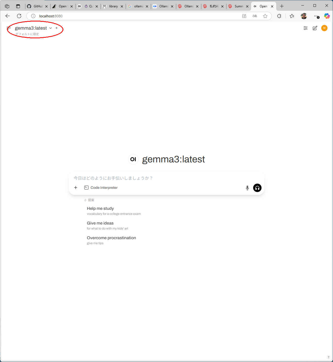 左上のドロップダウンリストの「gemma3」モデルが選択を確認する