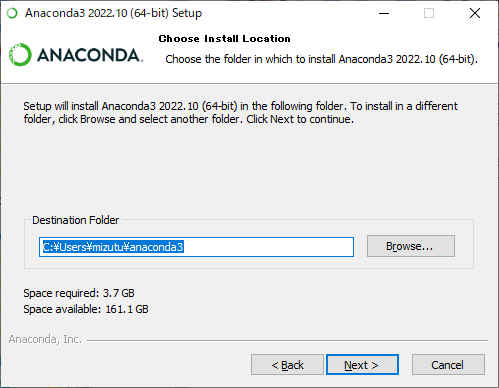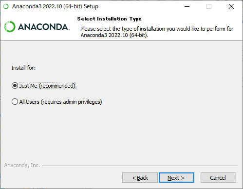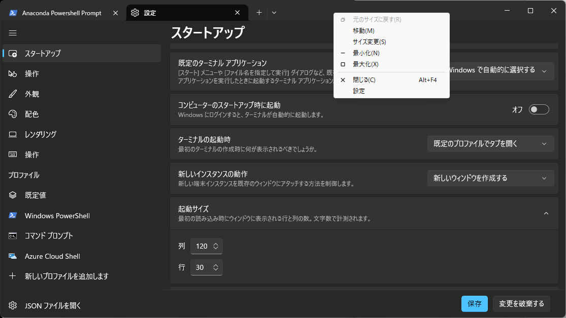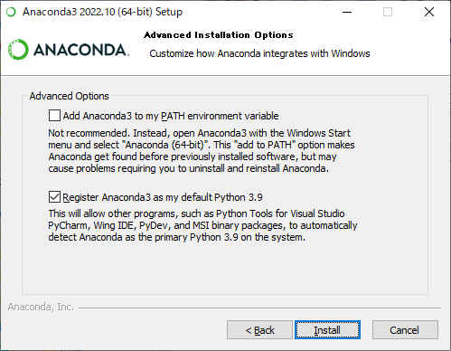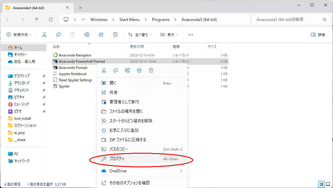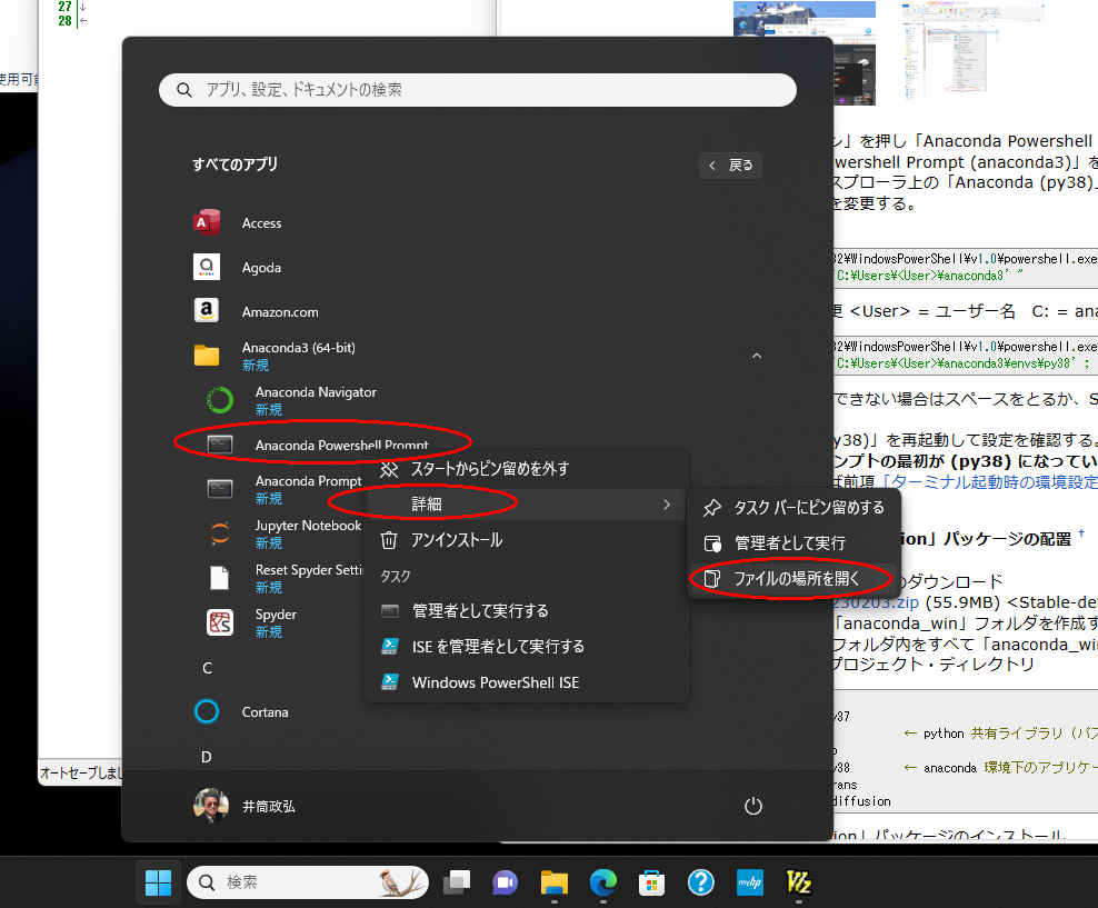 %windir%\System32\WindowsPowerShell\v1.0\powershell.exe -ExecutionPolicy ByPass -NoExit -Command "& 'C:\ProgramData\Anaconda3\shell\condabin\conda-hook.ps1' ; conda activate 'C:\Users\<User>\anaconda3' "・次のように変更 <User> = ユーザー名 C: = anaconda_winを配置したドライブ