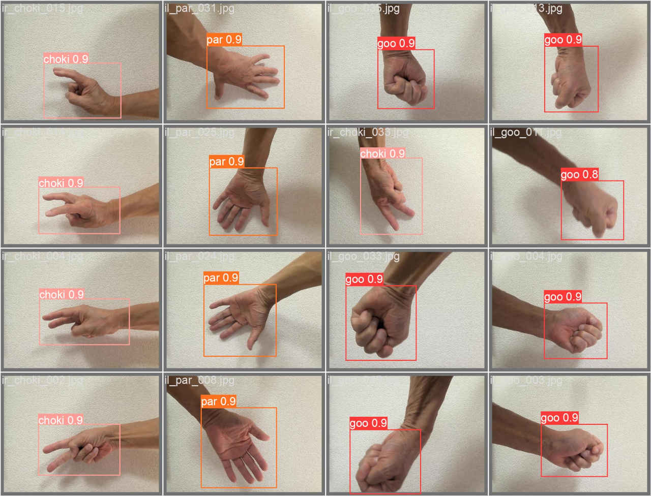 (py_learn) python train.py --epochs 100 --data data/janken4_dataset/janken4_dataset.yaml --weights yolov5s.pt --name janken4_yolov5s・GPU を使用しない場合は以下のコマンドを実行する