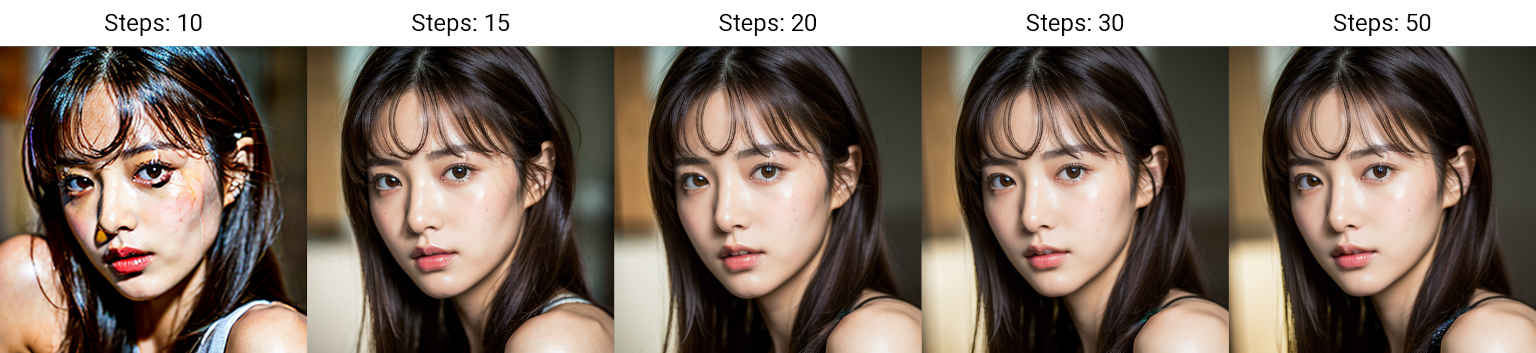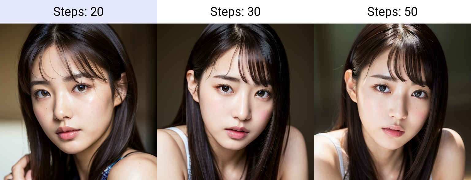 ■ 拡散モデルによる画像生成でノイズを除去する回数 ■ サンプリング回数が多いほど繊細な画像が出力されるが画像の生成に時間がかかります |