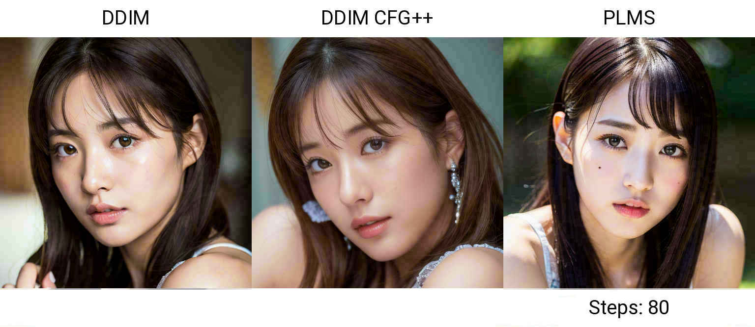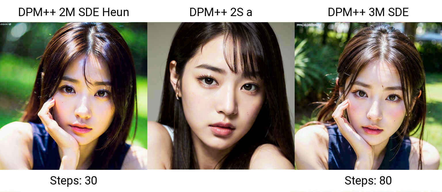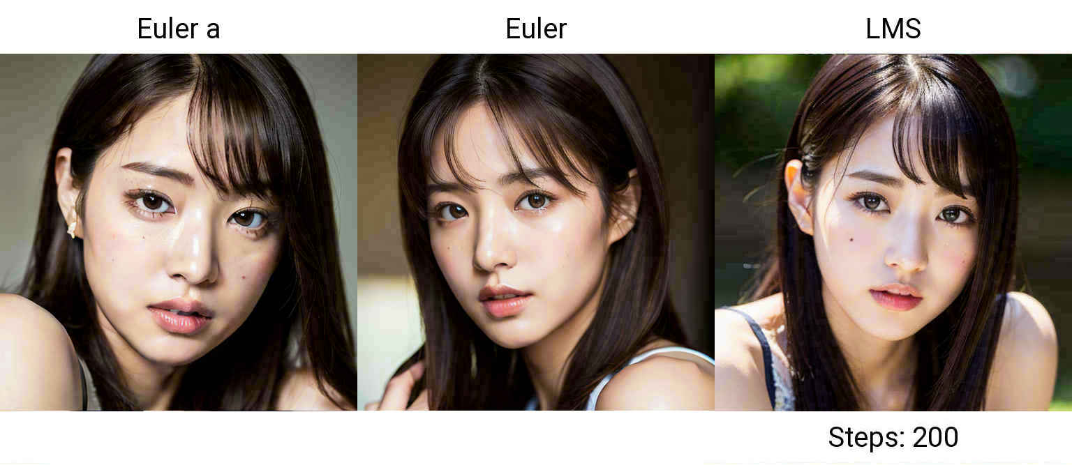 ・DPM++ 2M SDE, DPM++ 2M SDE Heun, DPM++ 3M SDE, LMS, DPM fast, PLM,LCM デフォールト値では正常な生成ができないので 他のパラメータを調整する必要がある モデルによって差はあるがおおむね Steps 80~100 が適当 LMS の場合は回数を増やしたほうが結果は良い 80 ~ 200 |