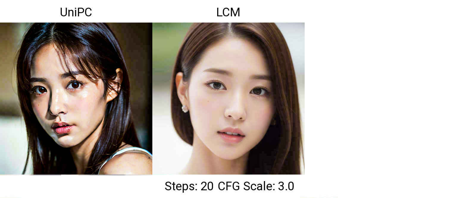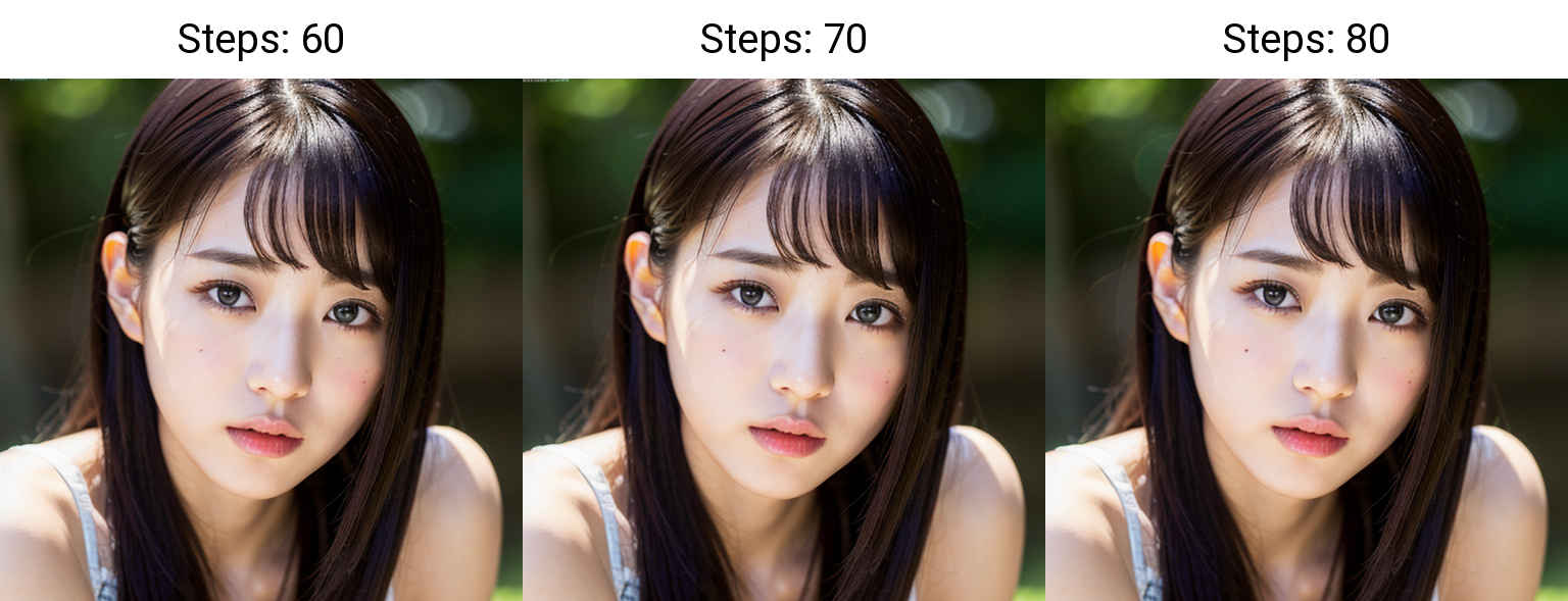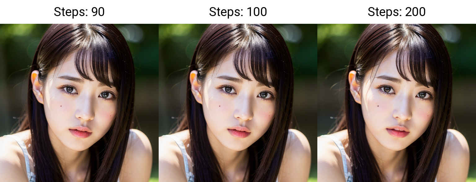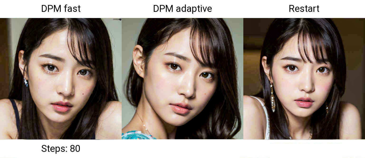 ・DPM++ 2M SDE, DPM++ 2M SDE Heun, DPM++ 3M SDE, LMS, DPM fast, PLM,LCM デフォールト値では正常な生成ができないので 他のパラメータを調整する必要がある モデルによって差はあるがおおむね Steps 80~100 が適当 LMS の場合は回数を増やしたほうが結果は良い 80 ~ 200 |