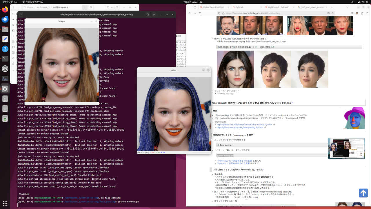 (py38_learn) python makeup2.py Motion Supervised co-part Segmentation Ver. 0.01: Starting application... - source_image : C:/anaconda_win/workspace_2/motion-co-seg/face_parsing/imgs/116.jpg - result_image : ./result_116.jpg - checkpoint : ./cp/79999_iter.pth - cpu : False