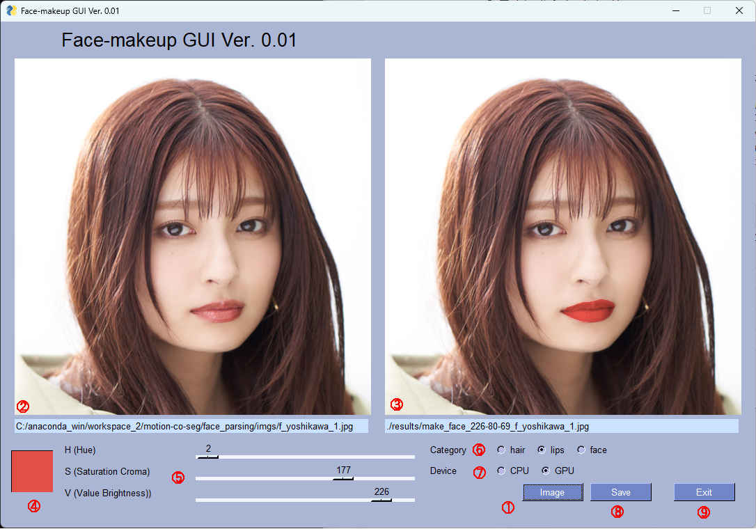 (py38_learn) python makeup_gui.py Face-makeup GUI Ver. 0.01: Starting application... - source_image : ./imgs/116.jpg - result_image : ./results/make_face_210-120-110_116.jpg - checkpoint : ./cp/79999_iter.pth - cpu : False - category : face - swap_color : [210, 120, 110] - log : 3 Finished.