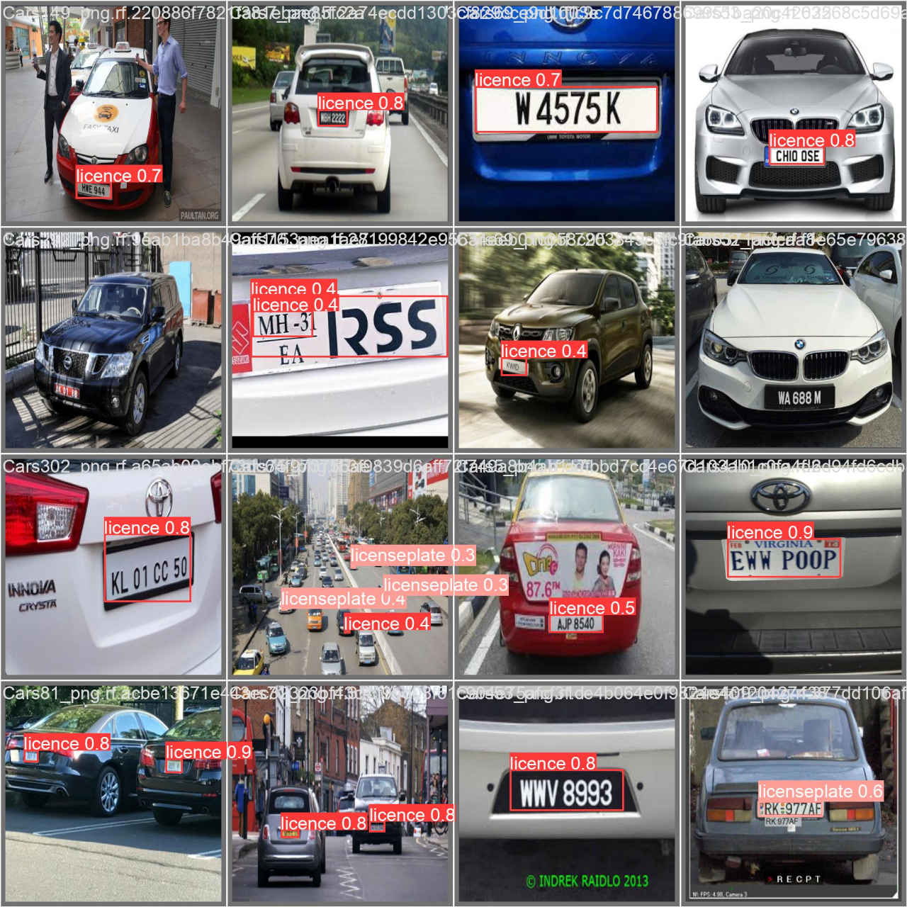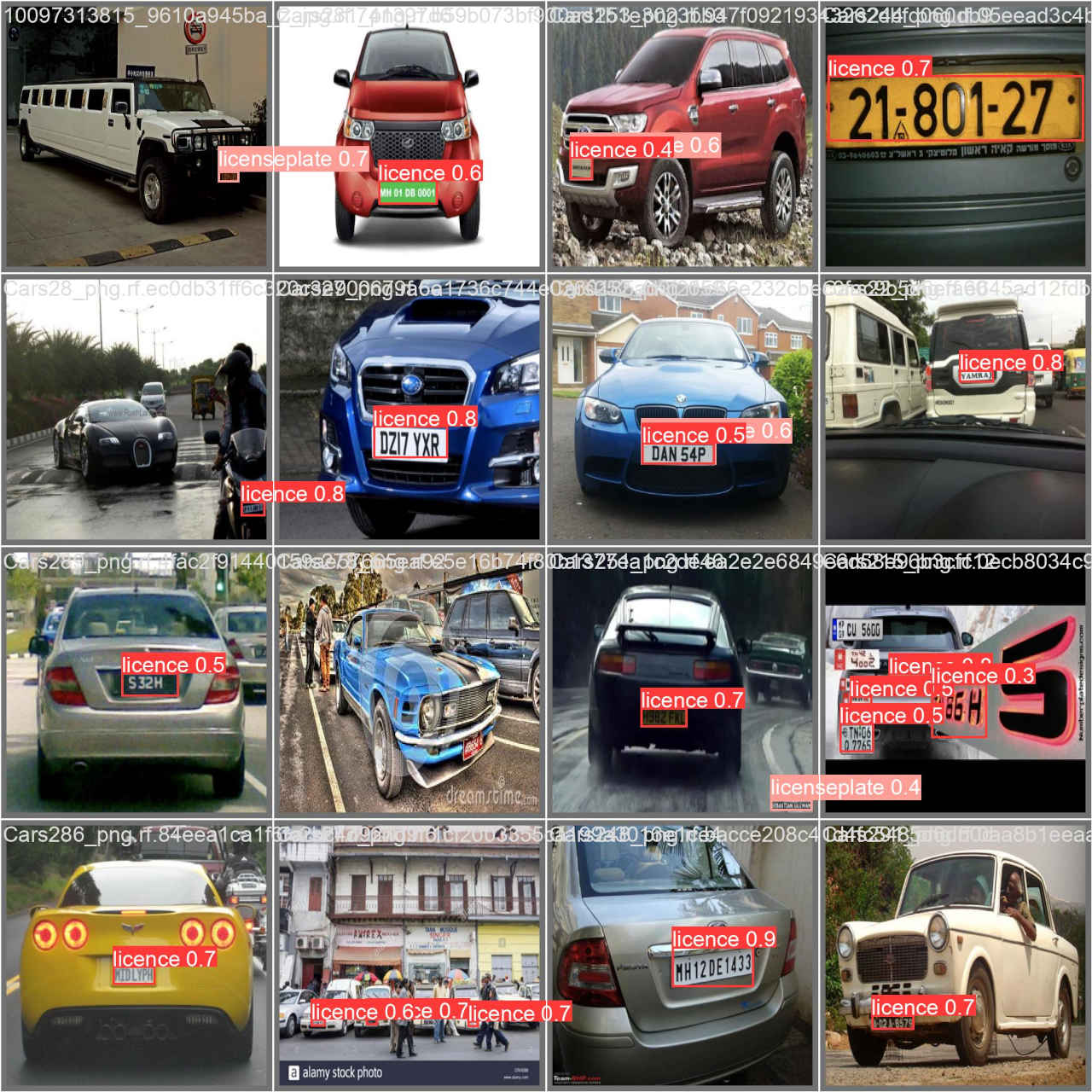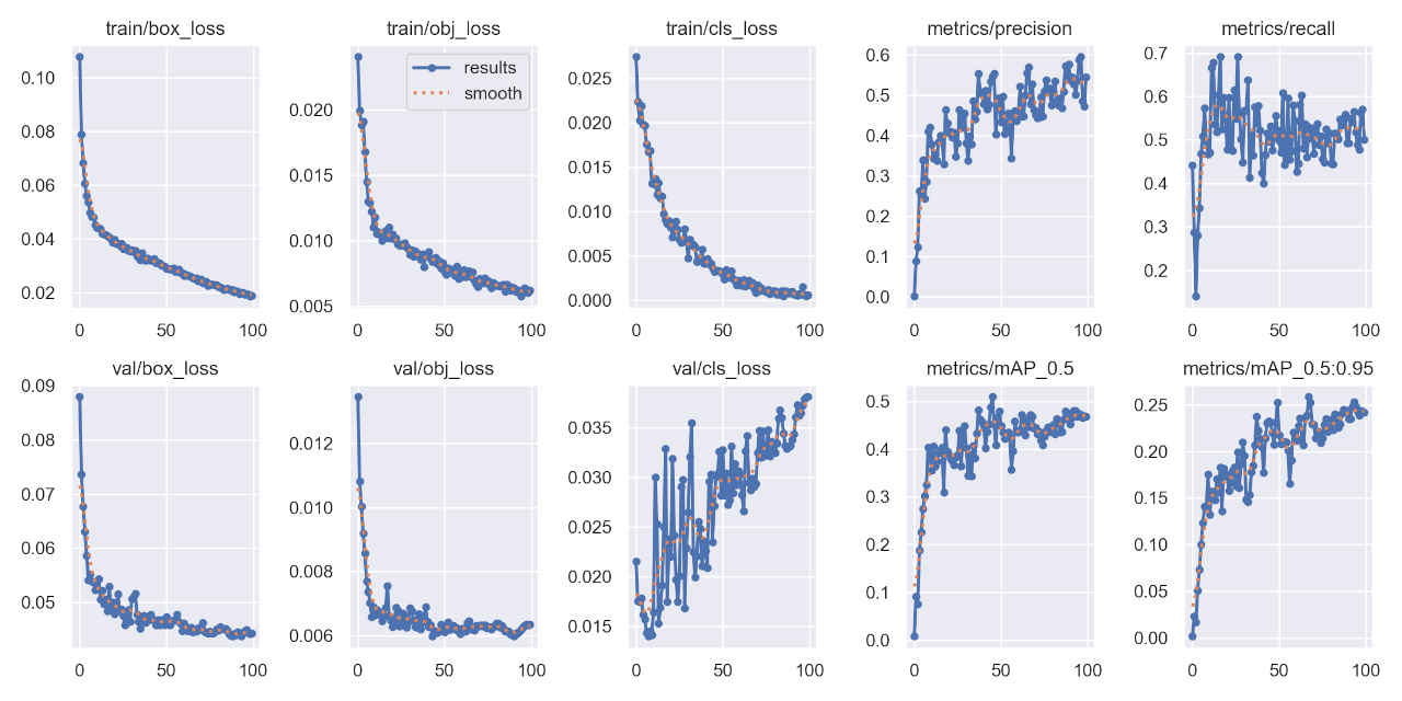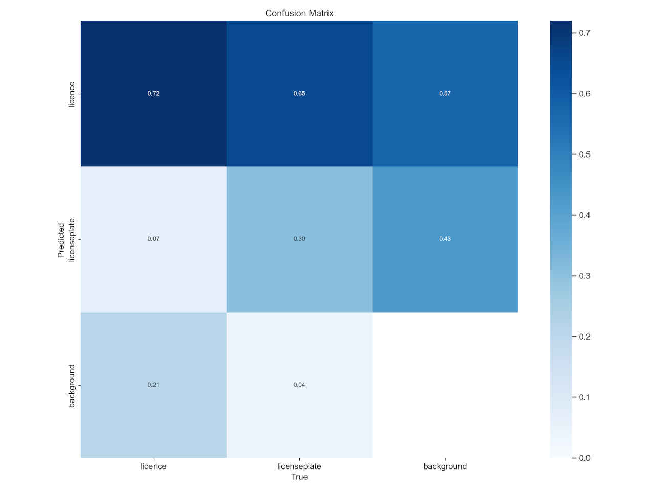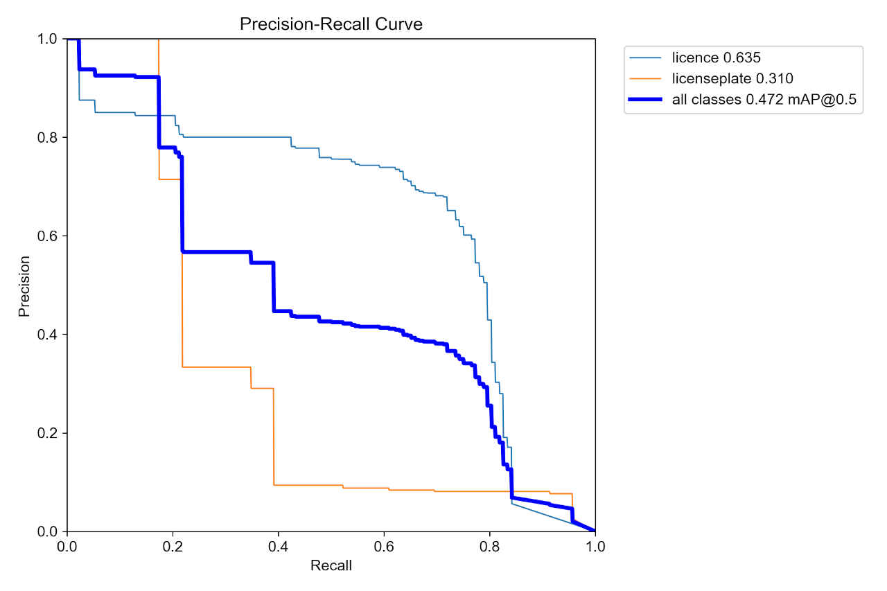 (py_learn) python train.py --epochs 100 --data data/vd_dataset/vd_data.yaml --weights yolov5s.pt --name vd_yolov5s_ep100 : Epoch GPU_mem box_loss obj_loss cls_loss Instances Size 99/99 4.17G 0.01894 0.006213 0.000583 12 640: 100%|██████████| 34/34 [00:02<00:00, 12. Class Images Instances P R mAP50 mAP50-95: 100%|██████████| 5/5 [00:00<0 all 136 155 0.544 0.5 0.468 0.242 100 epochs completed in 0.107 hours. Optimizer stripped from runs\train\vd_yolov5s_ep100\weights\last.pt, 14.4MB Optimizer stripped from runs\train\vd_yolov5s_ep100\weights\best.pt, 14.4MB Validating runs\train\vd_yolov5s_ep100\weights\best.pt... Fusing layers... Model summary: 157 layers, 7015519 parameters, 0 gradients, 15.8 GFLOPs Class Images Instances P R mAP50 mAP50-95: 100%|██████████| 5/5 [00:01<0 all 136 155 0.476 0.53 0.472 0.26 licence 136 132 0.681 0.712 0.635 0.333 licenseplate 136 23 0.27 0.348 0.31 0.187 Results saved to runs\train\vd_yolov5s_ep100