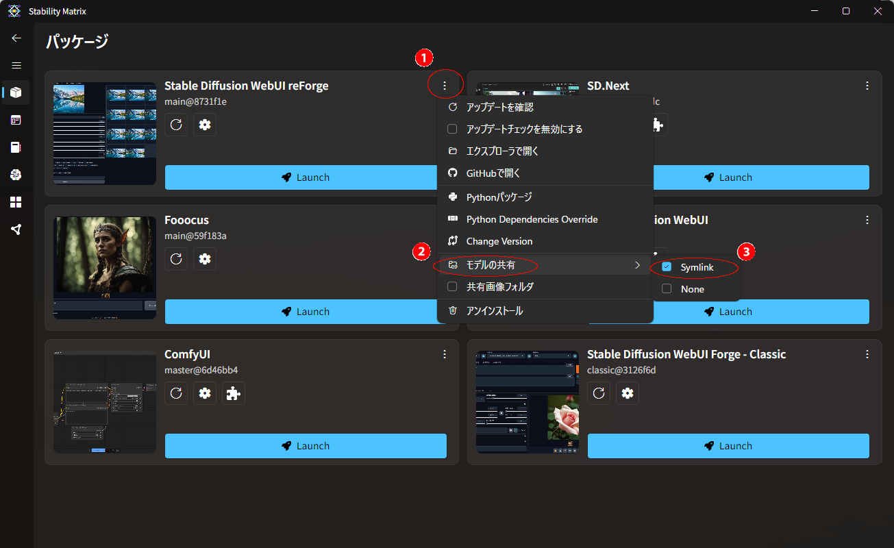 cd "C:\StabilityMatrix\Data\Packages\reForge" →「reForge」の場合 cd "C:\StabilityMatrix\Data\Packages\Stable Diffusion WebUI reForge" →「Stable Diffusion WebUI reForge」の場合 cd "C:\StabilityMatrix\Data\Packages\SD.Next\models" →「SD.Next」の場合 cd "C:\StabilityMatrix\Data\Packages\Stable Diffusion WebUI" →「Automatic1111」の場合・ジャンクションを作成