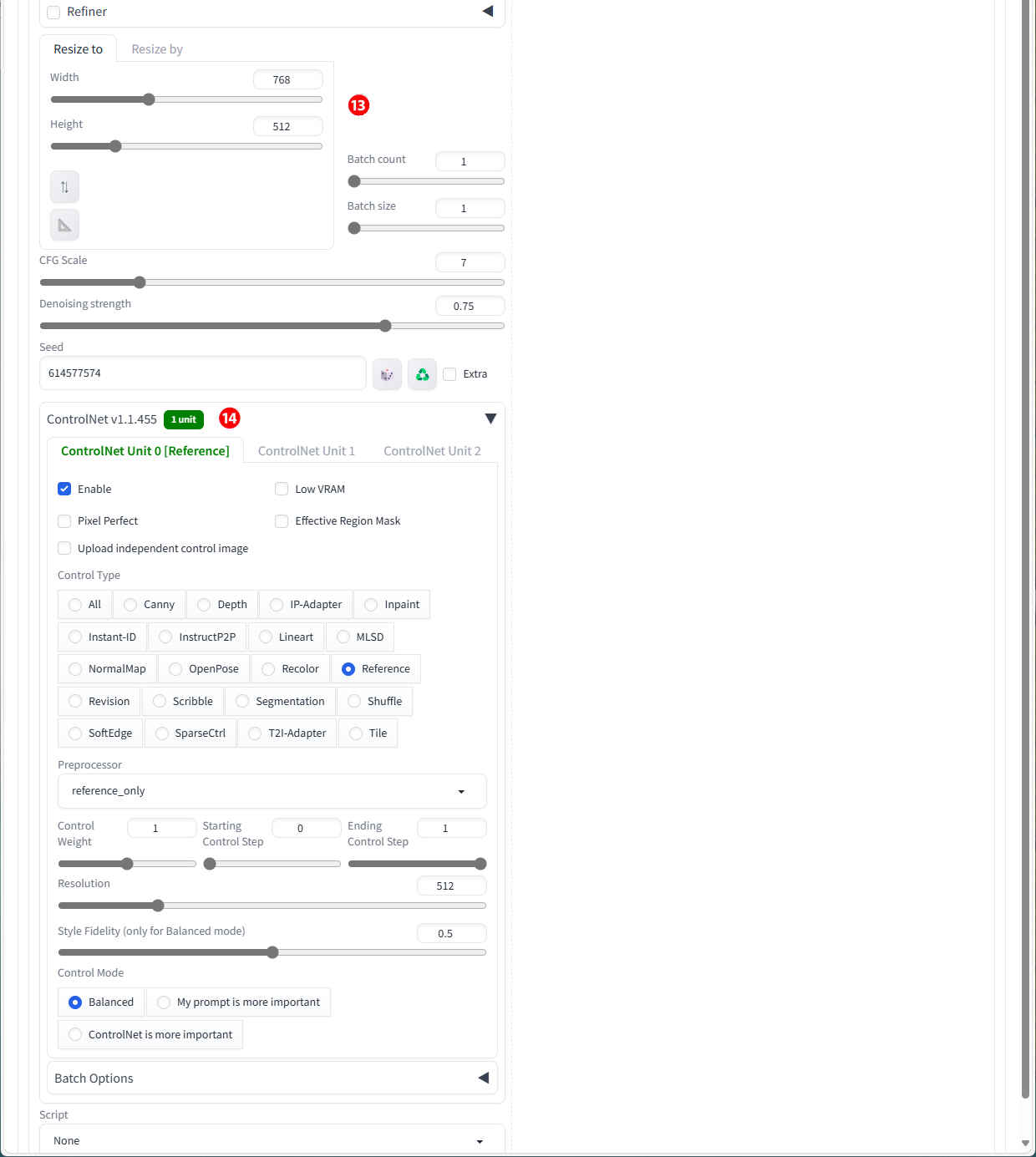 ⑭「ControlNet」の設定。「reference_only」を使用成