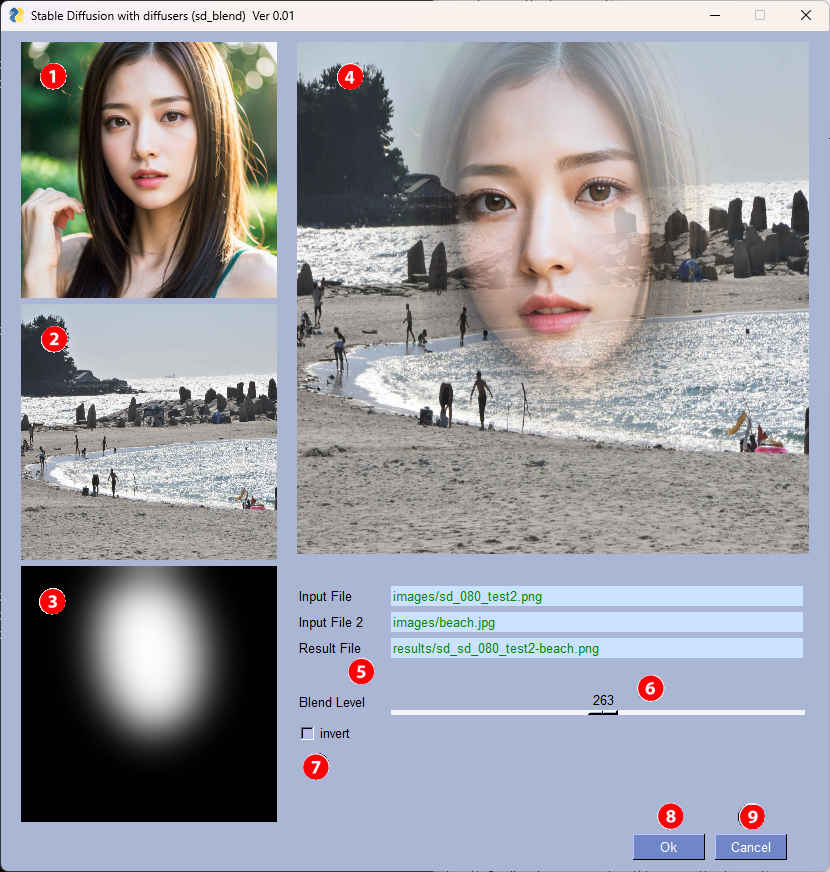 | sd_blend.py | 画像ブレンド合成プログラム | 2枚のイメージ画像をマスク画像でブレンドする |