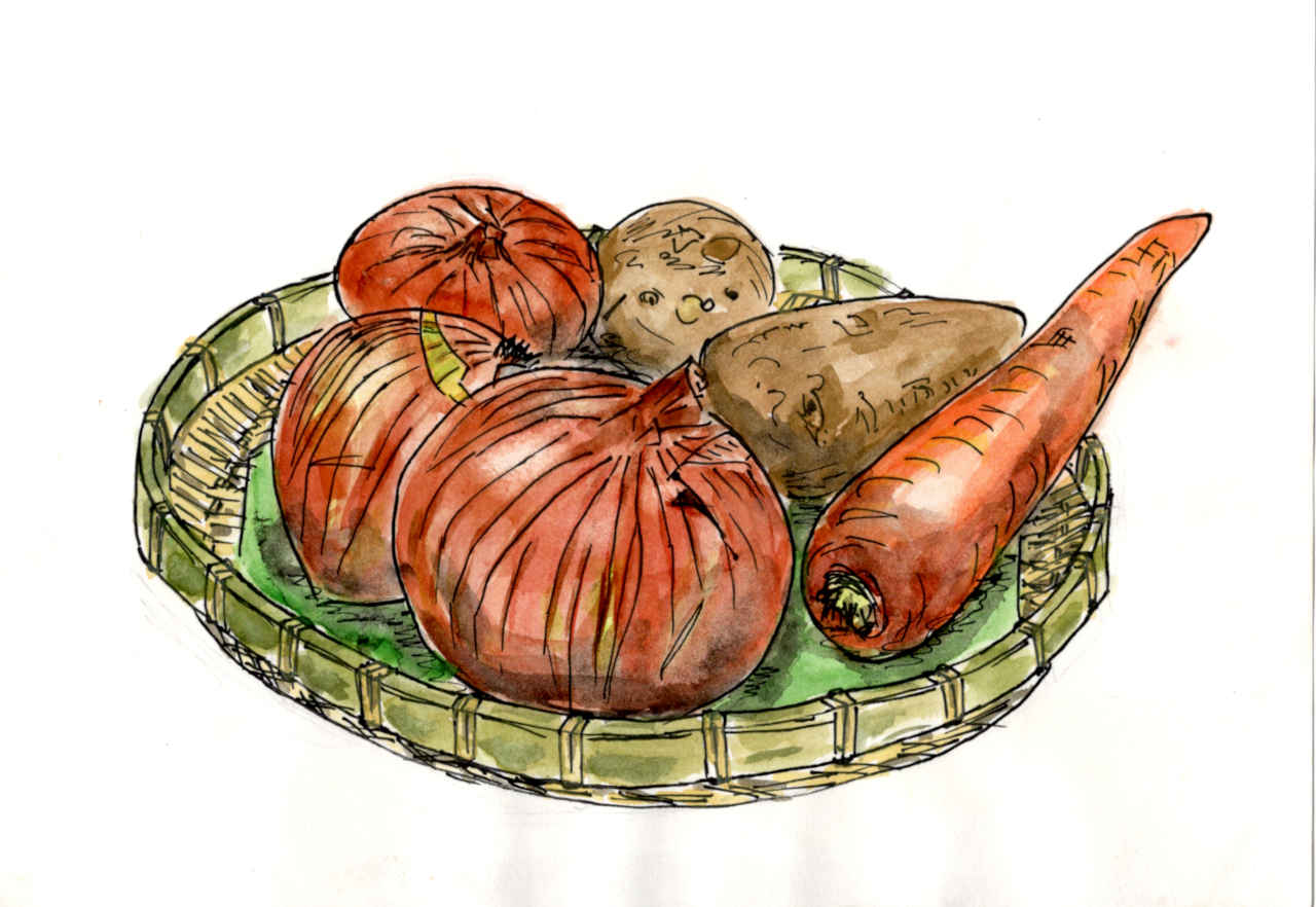 かごの中の野菜、水彩画、白い背景