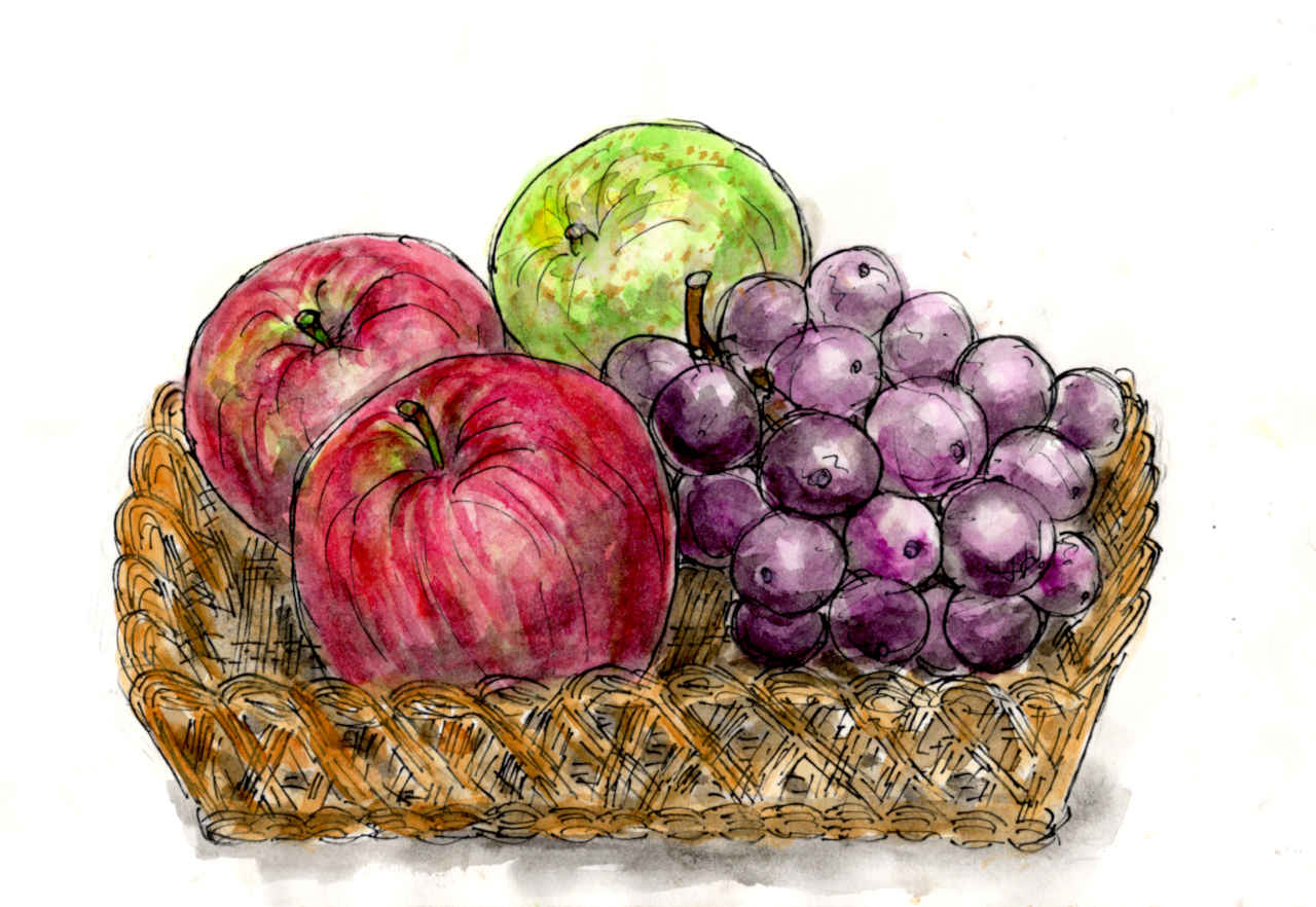 かごの中の果物、水彩画、白い背景