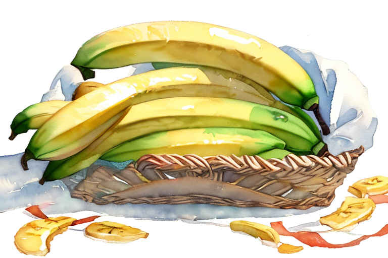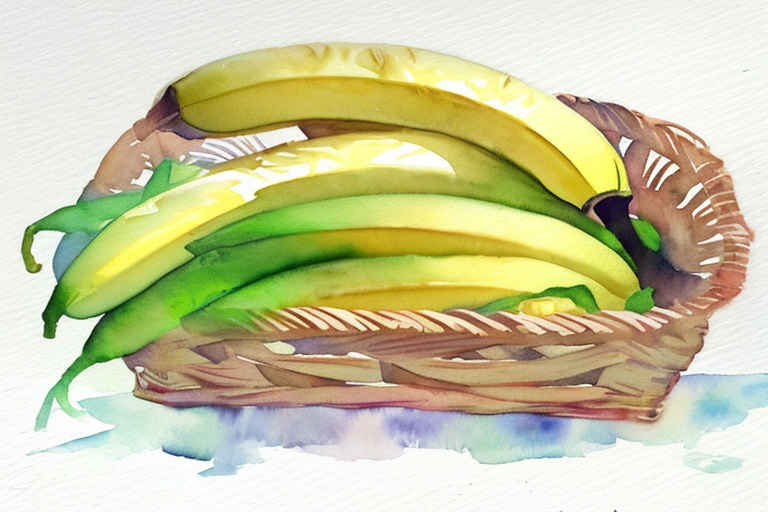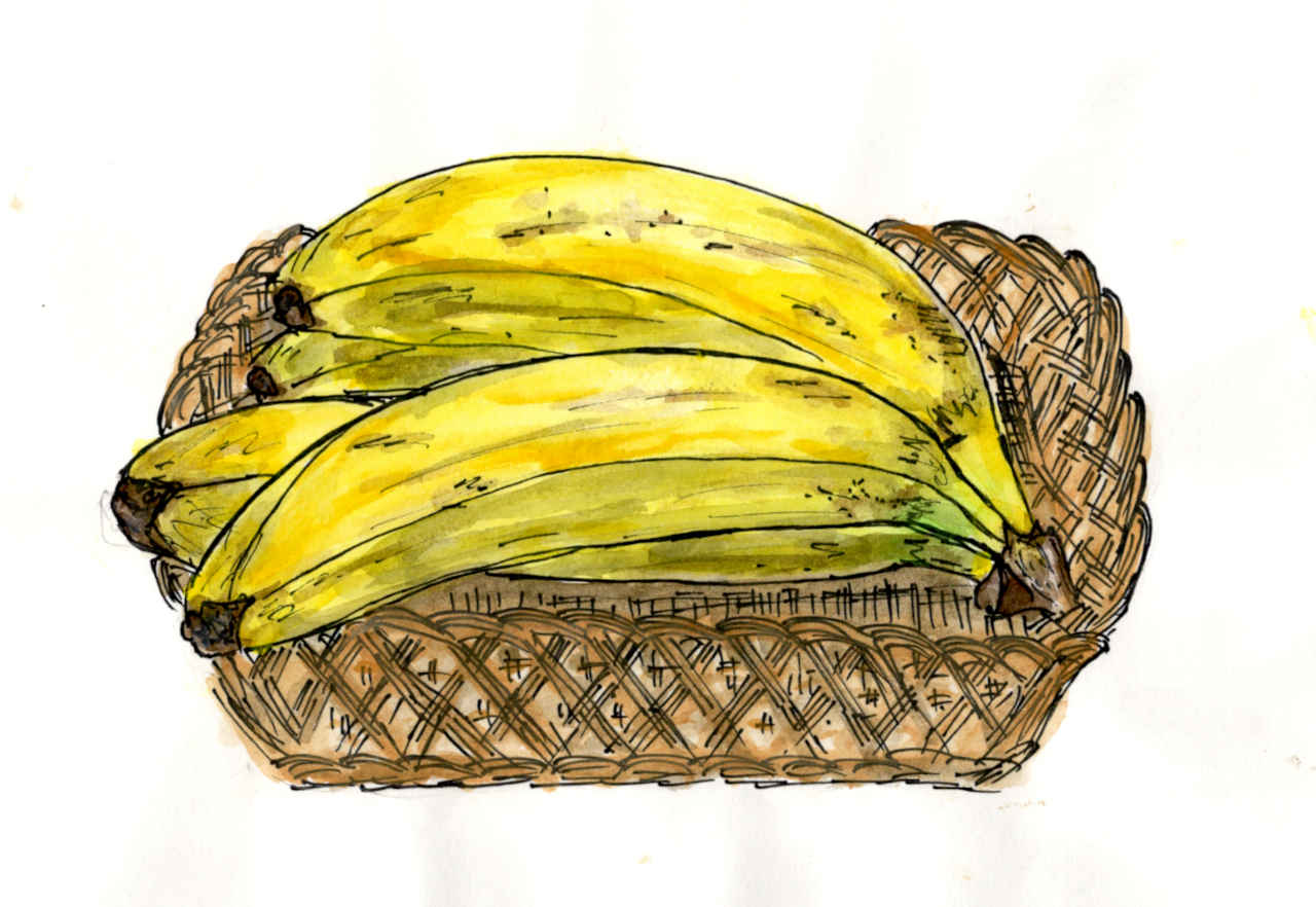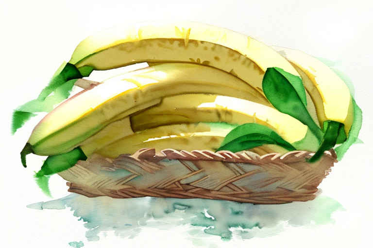 Bananas in a basket, watercolor painting, white background