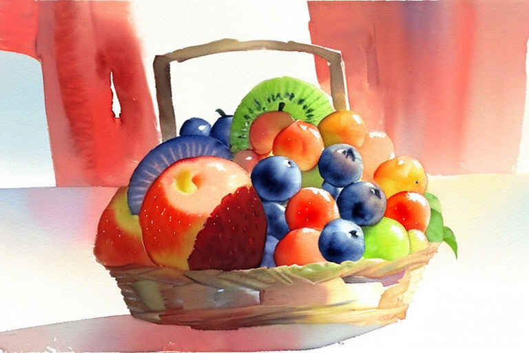 Fruits in a basket, watercolor painting, on a white background