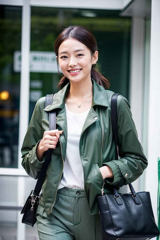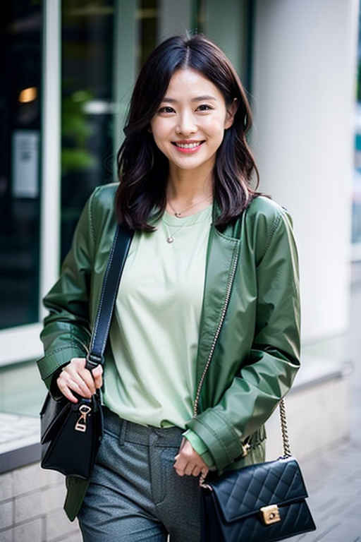| ① Interrogate CLIP | a woman in a green jacket and grey pants smiles while holding a black bag and a black purse in her hand, Chizuko Yoshida, neutral colors, a stock photo, private press | |